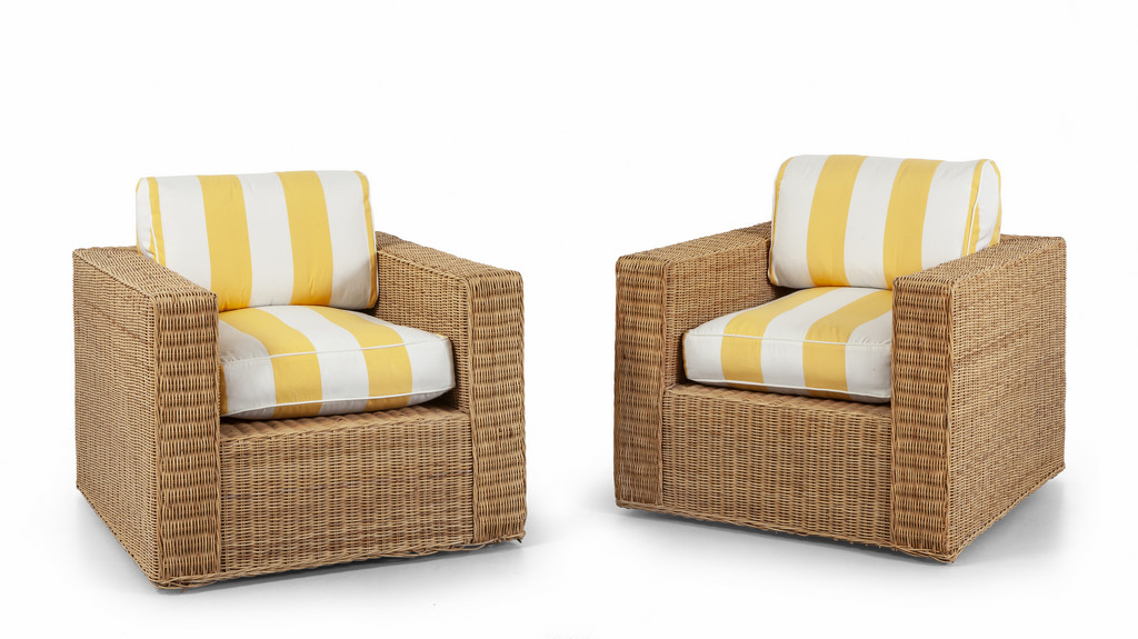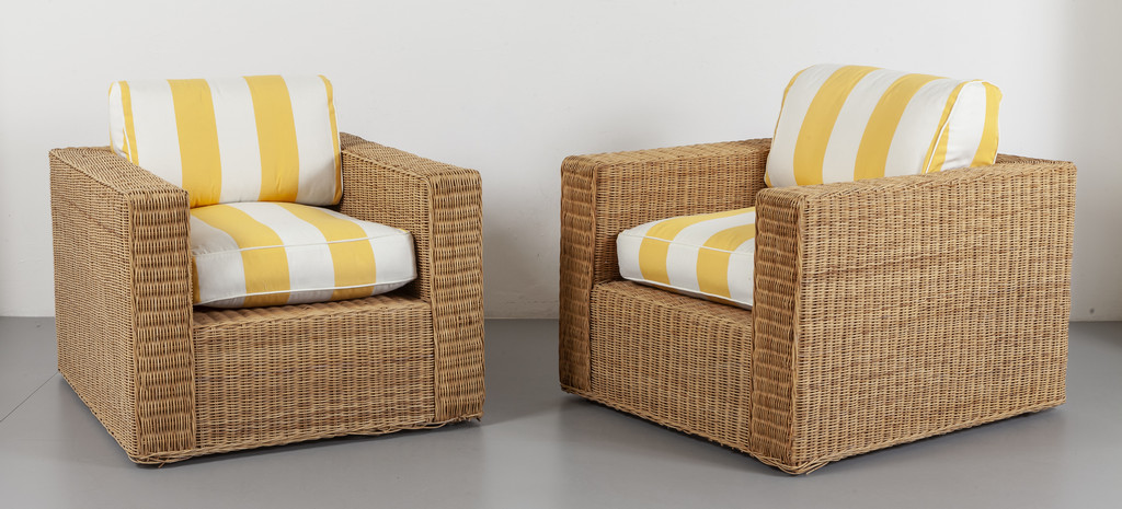 Strutture interne in legno, midollino, cuscini rivestiti in tessuto.