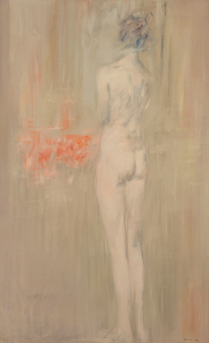 GIUSEPPE AJMONE Carpignano Sesia 17/02/1923 - Romagnano Sesia 07/04/2005 Allo specchio, 1967 olio su tela cm. 145x89, firma e anno in basso a destra, titolo e anno al retro, dichiarazione d'autenticità dell'artista su foto, opera registrata presso l'Archivio Giuseppe Ajmone al n° B/58 come da dichiarazione su foto.