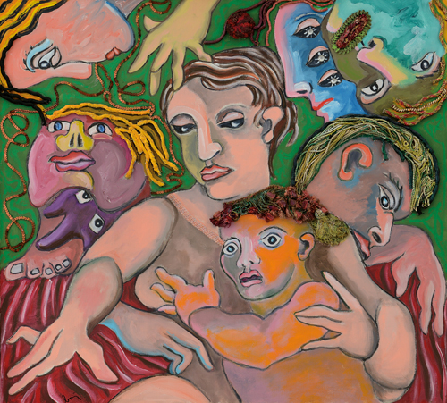 ENRICO BAJ Milano 31/10/1924 - Varese 15/06/2003 Personaggi, 1988 acrilici e collage di passamanerie su tela cm. 92x100, firma in basso a sinistra, dichiarazione d'autenticità con archivio n° 2239.A datata 23.11.2010 a cura di Roberta Cerini Baj su foto, etichetta per garanzia di autenticità e provenienza della San Carlo Casa d'Aste e Galleria (TO) su foto.