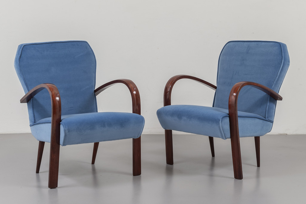 Strutture in legno, gambe e braccioli in legno di faggio tinto all'anilina, parti imbottite rivestite in velluto.