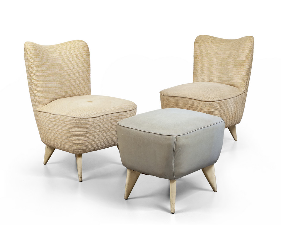 Due poltroncine e un poggiapiedi della serie "Perla" per ISA, circa 1952.