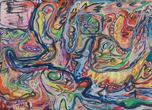 ALDO MONDINO Torino 04/10/1938 - 10/03/2005  Composizione, 1961 olio su tela cm. 50x70, firma e anno in basso a sinistra, etichetta e timbri della Galleria Accademia (MI) al retro, opera registrata presso l'Archivio Aldo Mondino come da dichiarazione su certificato con foto allegata.