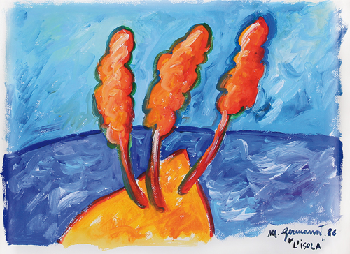 MIMMO GERMANA Catania 02/07/1944 - Busto Arsizio 1992  L'isola, 1986 tecnica mista su carta cm. 55x75, firma, titolo e anno in basso a destra, opera registrata presso l'Archivio Generale dell'Opera di Mimmo Germanà come da dichiarazione su certificato con foto allegato.