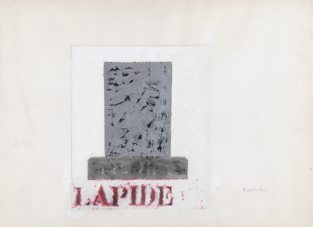 TANO FESTA Roma 02/11/1938 - Roma 09/01/1988 Lapide, 1963 tecnica mista su cartoncino cm. 50x70, opera non firmata, anno sulla destra, registrata presso l'Archivio delle Opere di Tano Festa a cura della figlia Anita come da dichiarazione su foto, dichiarazione di provenienza Arturo Schwarz su foto.