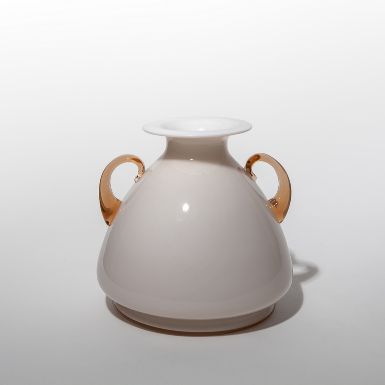 Un vaso in vetro incamiciato lattimo e rosa con due anse applicate in vetro salmone, anni