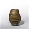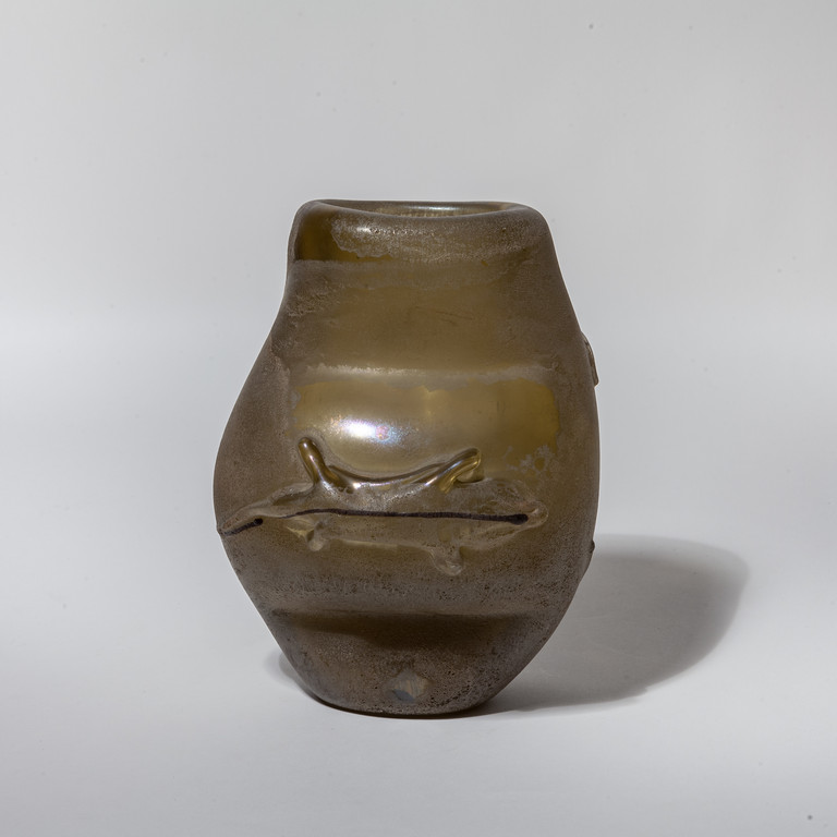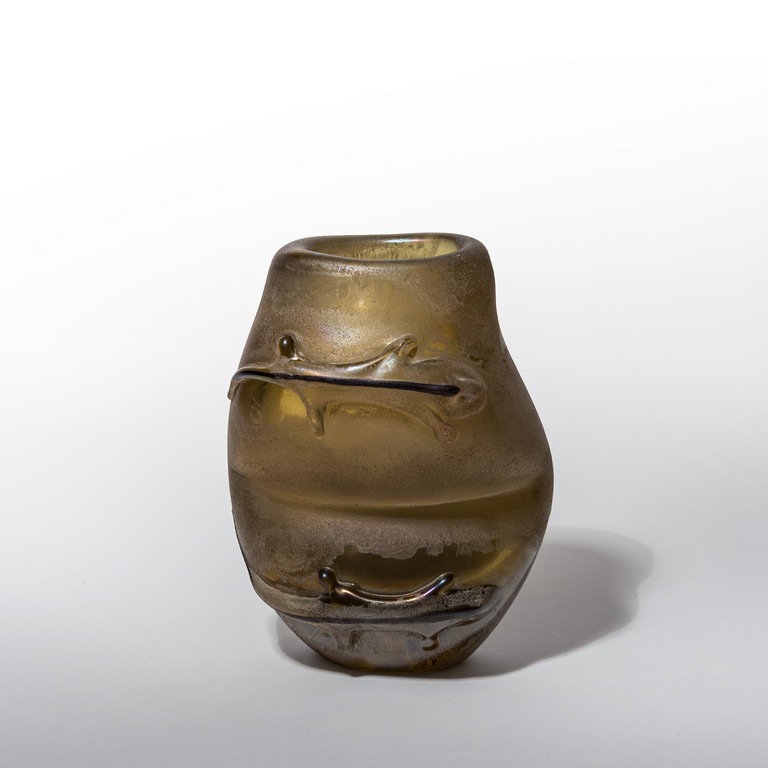 Raro vaso in vetro ambra acidato dal corpo irregolare con applicazione di tre lucertole a