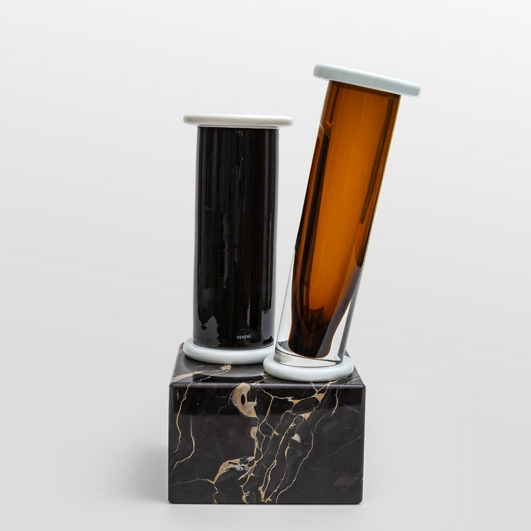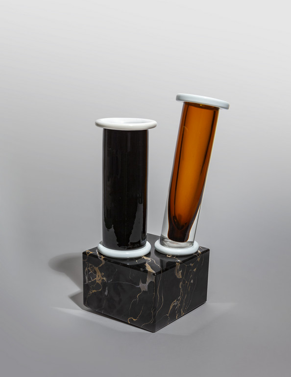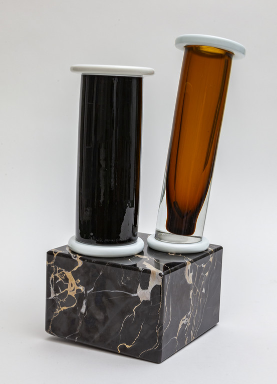 "Marito e moglie", composizione di due cilindri in vetro bordati di lattimo poggianti su base