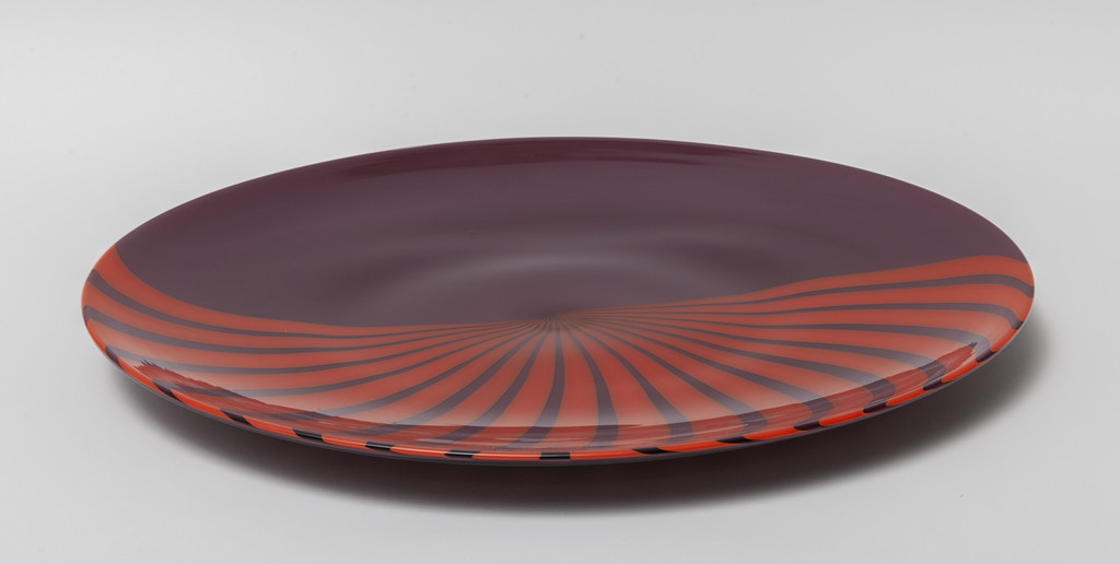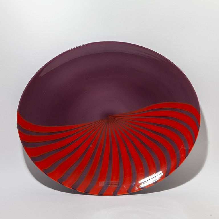 Un piatto ovale della serie "giano" in vetro viola con canne color corallo su mezza