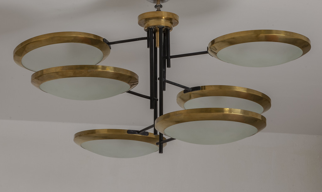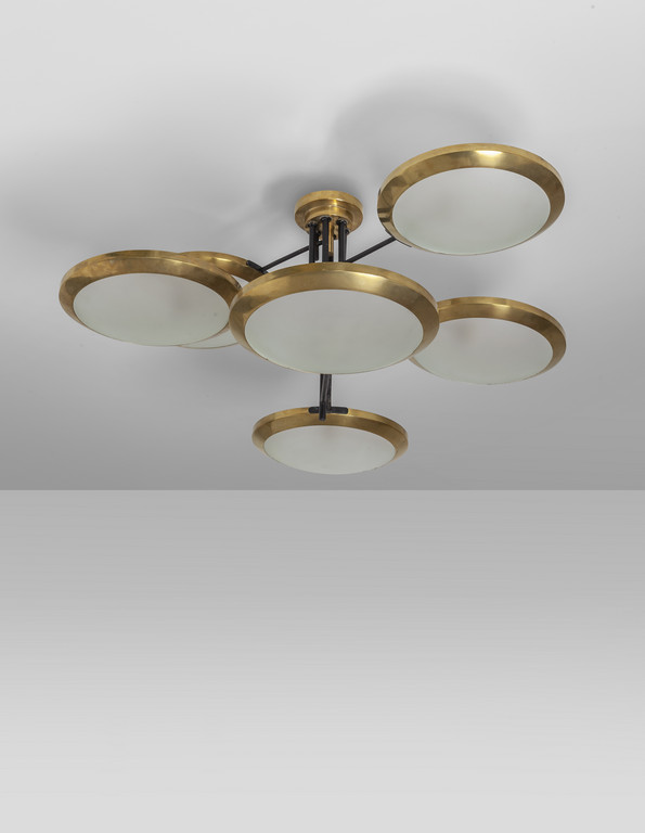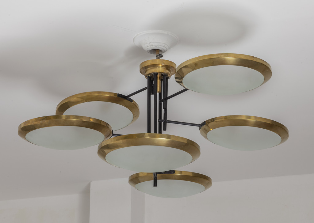 Ottone lucido e laccato, vetro stampato curvato e satinato.