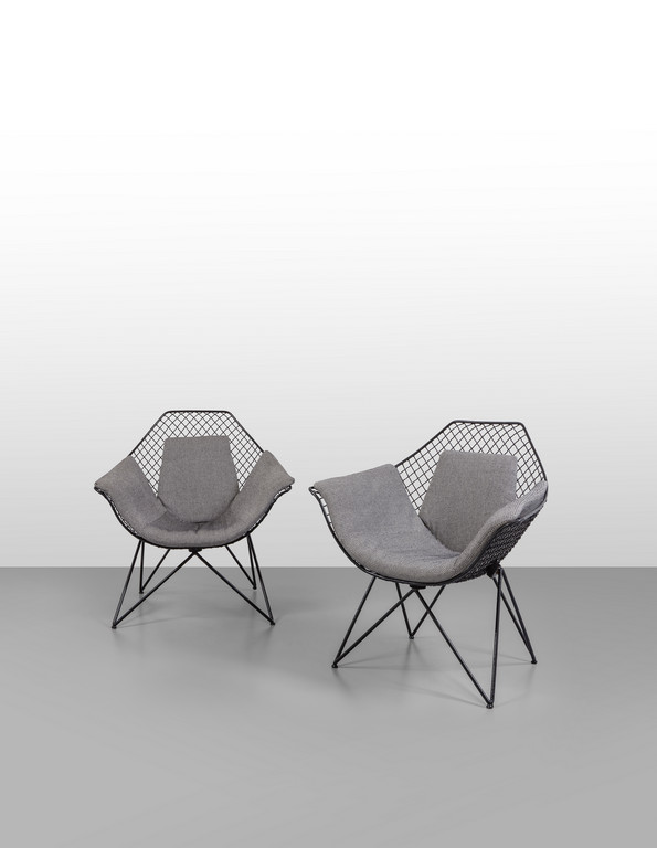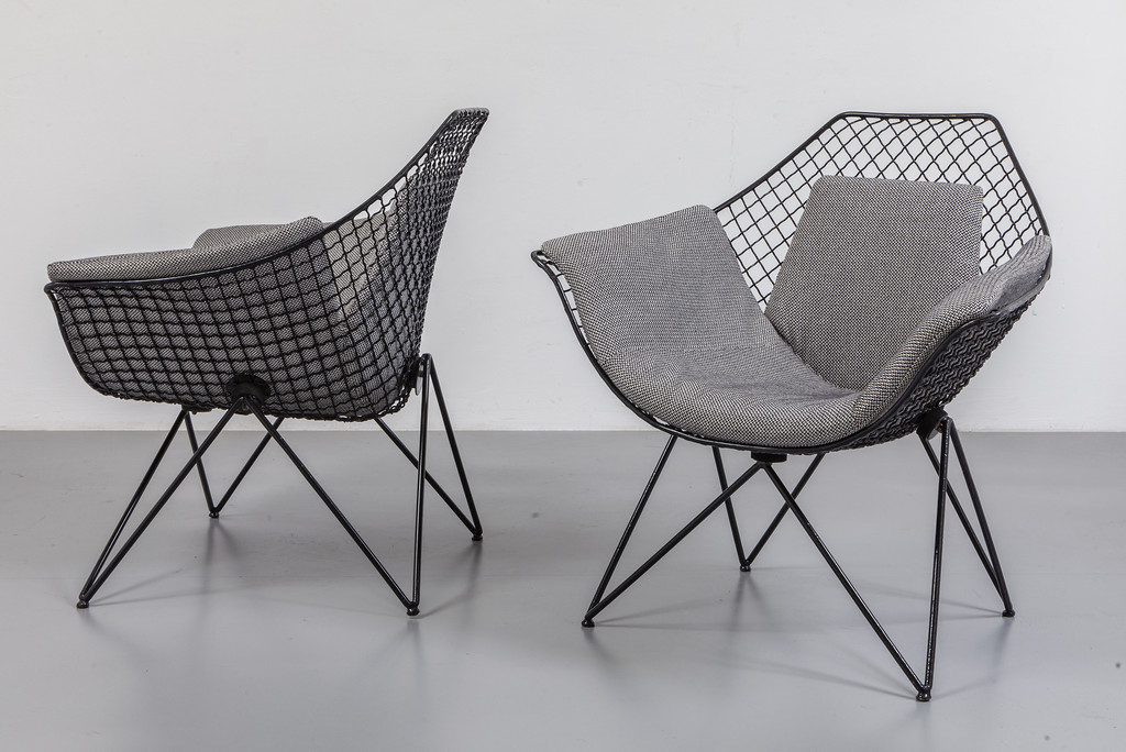 Tondino e rete di acciaio verniciati, cuscini rivestiti in tessuto.