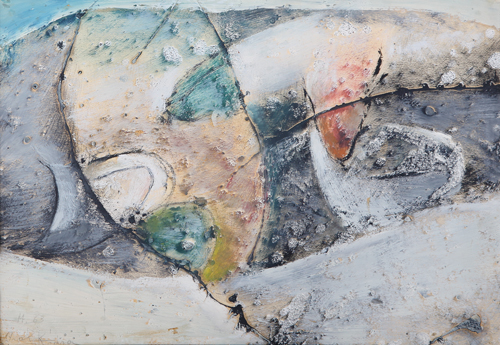 IBRAHIM KODRA Ishmi (Albania) 1918 - Milano 08/02/2006 Senza titolo, 1963 olio e tecnica mista su cartone cm. 35x50, firma e anno in basso a sinistra.
