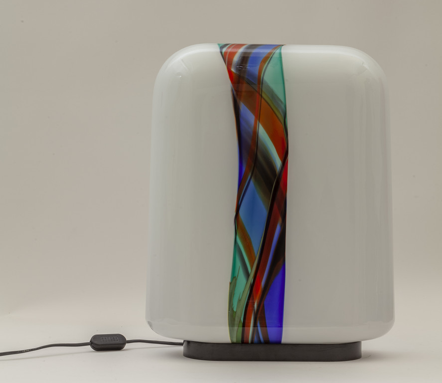 Acciaio verniciato, vetro opalino con fascia policroma.