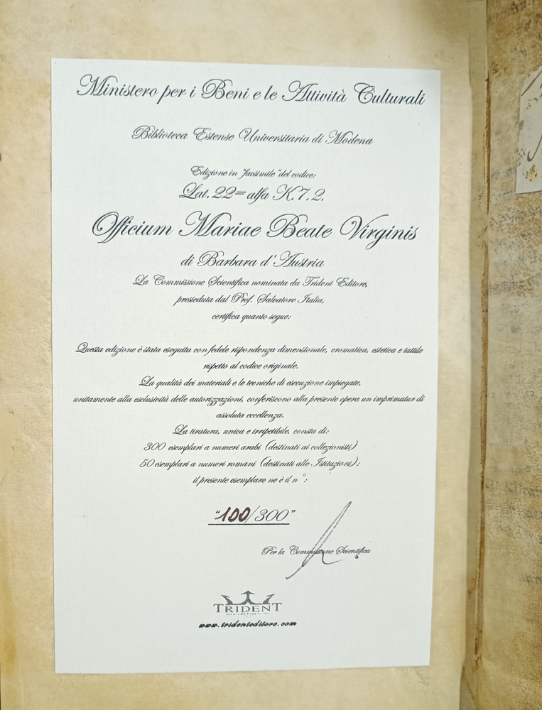 Riproduzione facsimiliare del manoscritto in tiratura autorizzata dalla Biblioteca Estense di Modena, in tiratura 100/300.