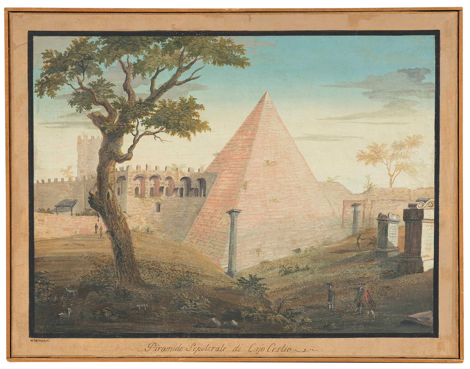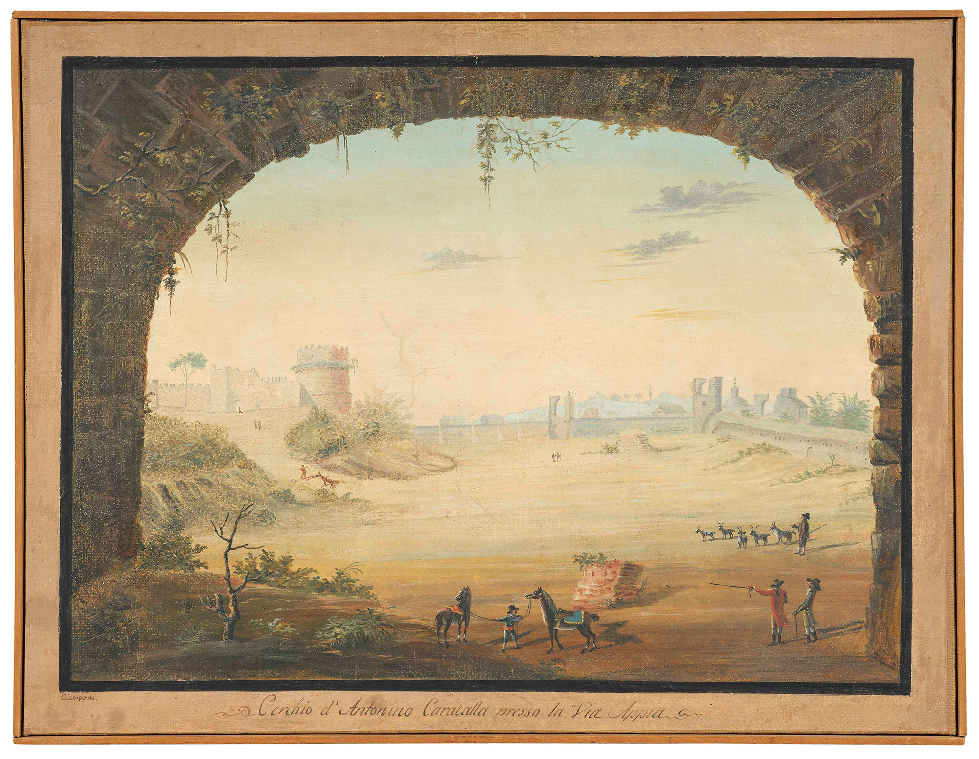 Giuseppe Giampedi, Vedute di Roma sei dipinti, Firmati "Giampedi" in basso a sinistra, Recano al retro etichetta dell'antiquario E. Imbert (via S. Spirito, Milano), tempera su carta applicata su tela, W. 55 - H. 42 cm, Galleria Silva, Milano