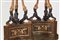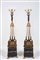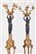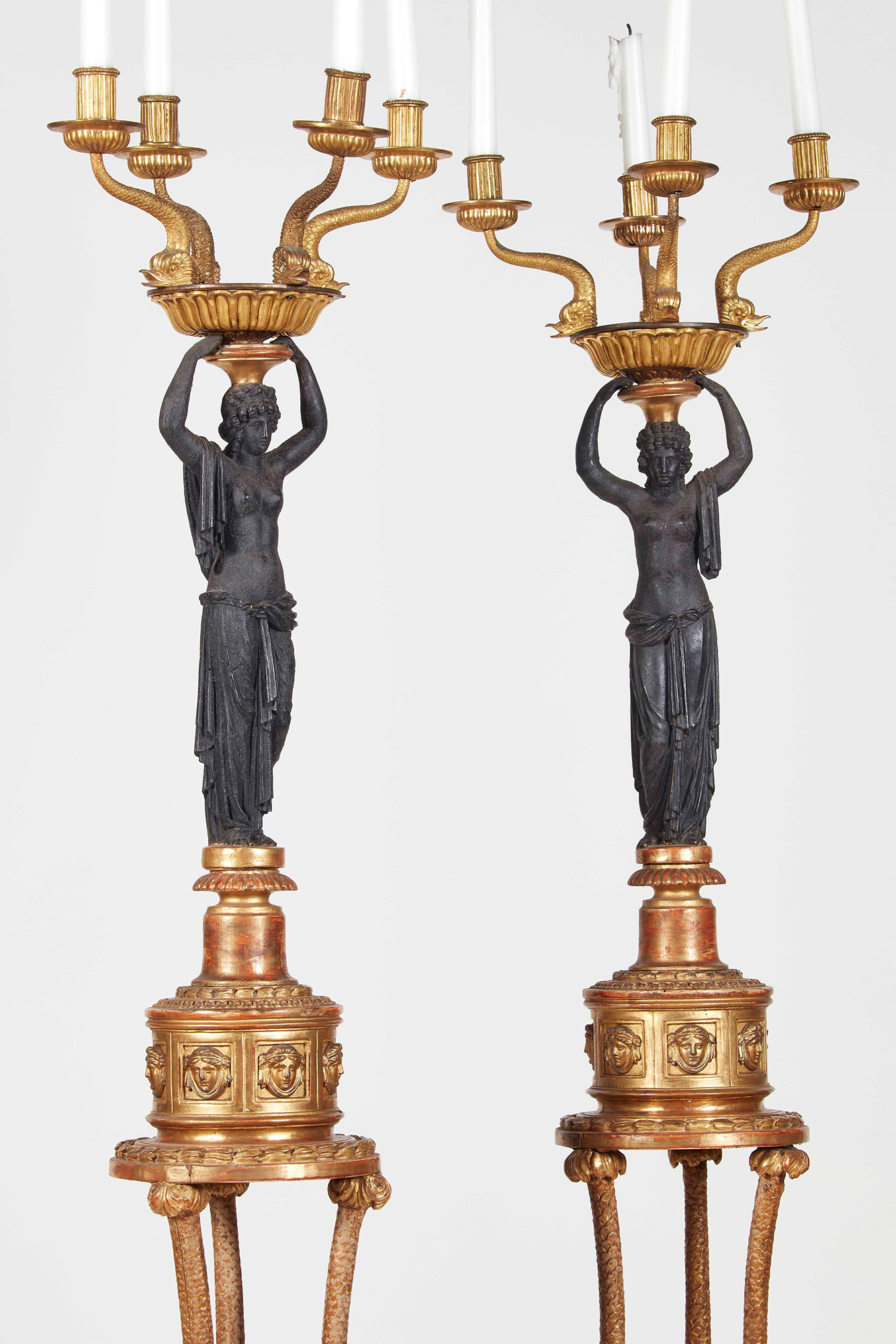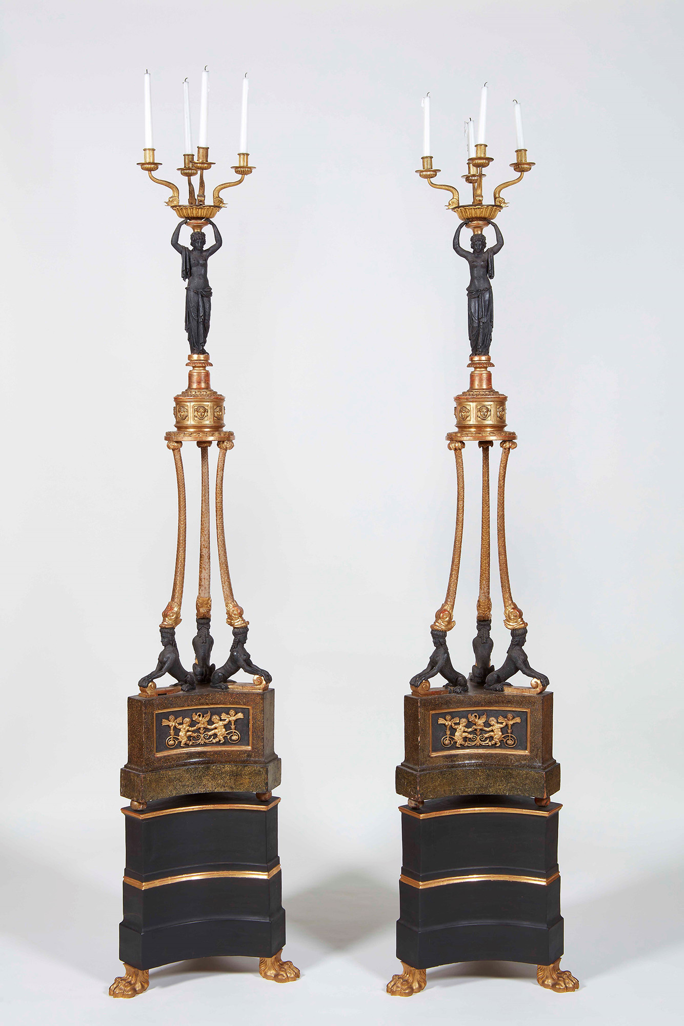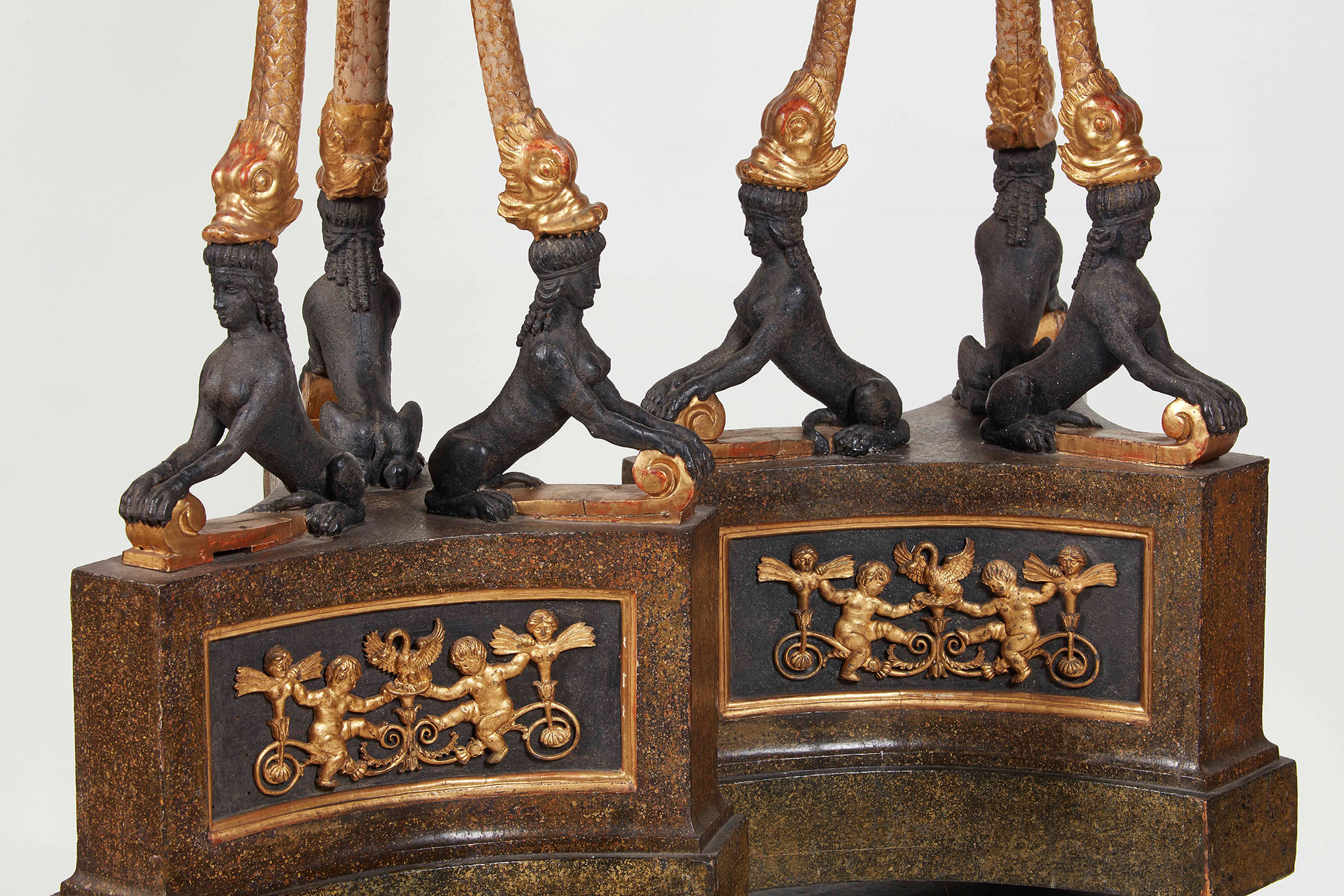 Importante e rara coppia di candelabri in legno scolpito, patinato e dorato. Regno Borbonico fine XVIII secolo Quattro fiamme in bronzo dorato a guisa di mostri marini sorretti da vestali poggianti su tritoni in legno dorato e tre sfingi. Base trilobata in legno laccato a finto marmo decorata da riserve con putti danzanti in bronzo sbalzato e dorato. Supporti non coevi in legno ebanizzato con dettagli dorati e piedi ferini, H. 202 cm, Manuel Longo, Milano, Le caratteristiche stilistico-decorative e costruttive degli arredi del Sud Italia alla fine del XVIII secolo risentirono fortemente della tradizione barocca e il rinnovamento del Rococò tardò ad essere recepito. Le forme presero spunto dagli arredi francesi ma le sagomature risultarono appesantite, la leggiadria del Rococò venne spesso tramutata in opulenza e ricchezza. In Sicilia gli arredi in legno intagliato vennero spesso dorati, la decorazione a lacca fu ampiamente diffusa, l’ornato fu perlopiù affidato al repertorio faunistico e floreale accostato a dorature.