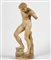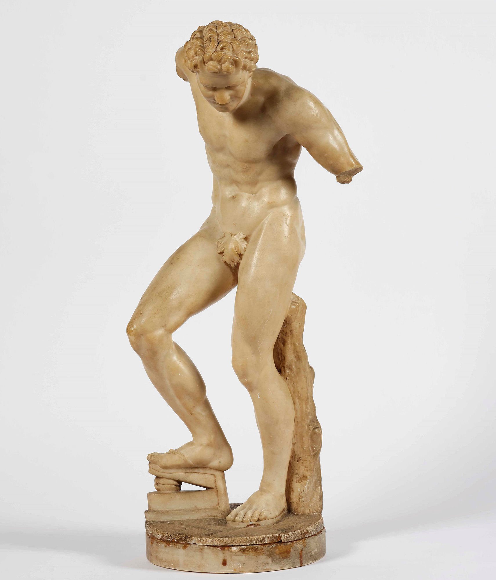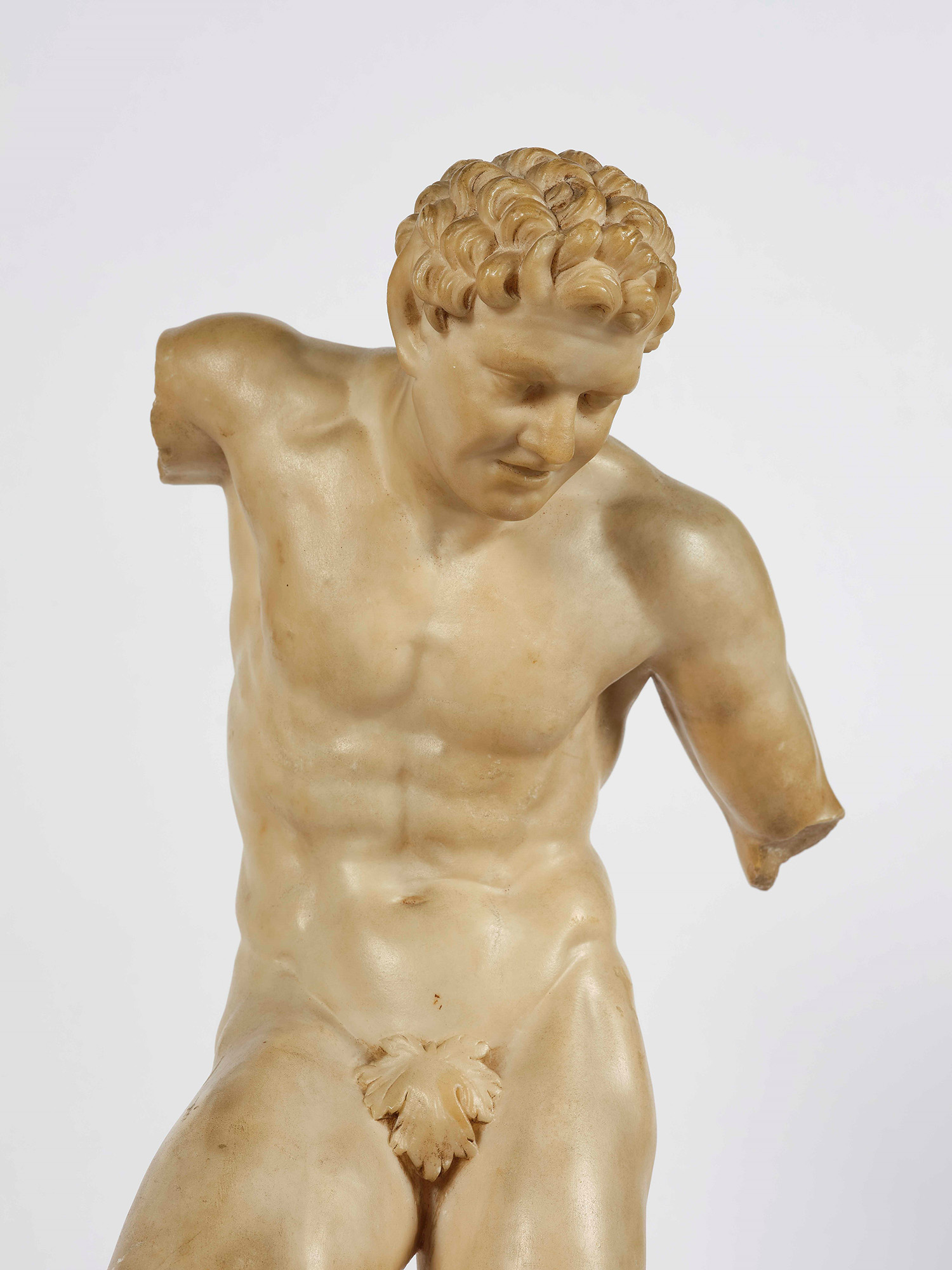 Fauno danzante (Fauno Medici). Alabastro. Arte del XIX secolo. Firma incisa Abel La scultura prende ispirazione dal fauno danzante che suona i cimbali, copia romana del III secolo dC. da un originale ellenistico conservato presso la tribuna della Galleria degli Uffizi a Firenze., Il fauno, che reca la firma Abel sulla sommità del cippo, potrebbe ragionevolmente essere ascritto all'opera dello scultore francese Abel Dimire (1794-1864), non nuovo a soggetti di gusto classicheggiante come il cavatore di spine, scultura in marmo conservata presso il Museo di Belle Arti di Lione databile al 1829 o il bassorilievo raffigurante "Enea ferito guarito da Venere" con cui vinse nel 1819 il prix de Rome e gli valse la possibilità di ottenere un soggiorno di studio all'Accademia francese di Roma dal 1919 al 1824. , , H. 61 cm, Leone Pasquale, Napoli