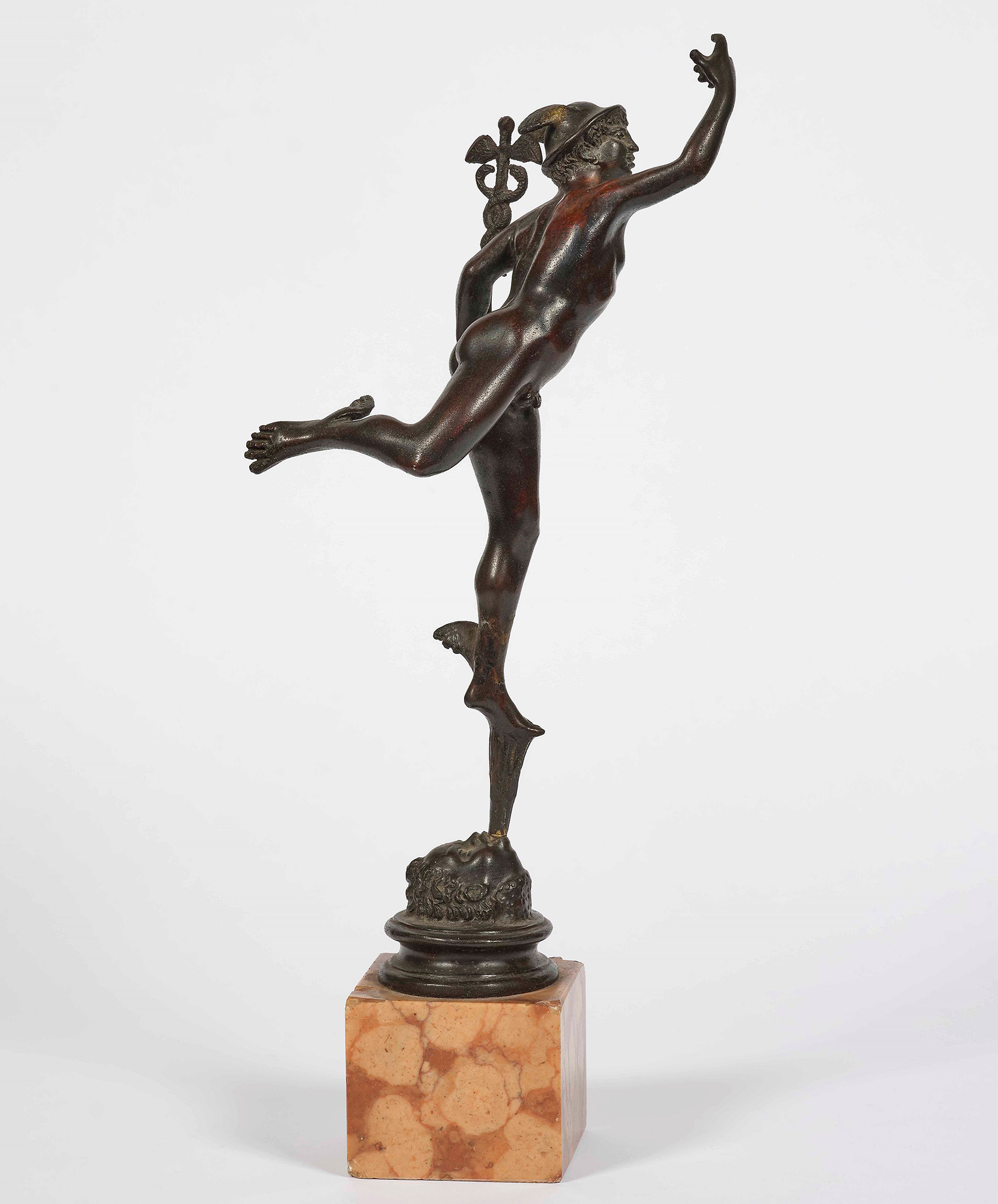 Mercurio del Giambologna in bronzo patinato. Fonditore del XIX secolo Montata su base in marmo rosso di Verona, altezza cm 38,5, Galleria de Munari, Vicenza
