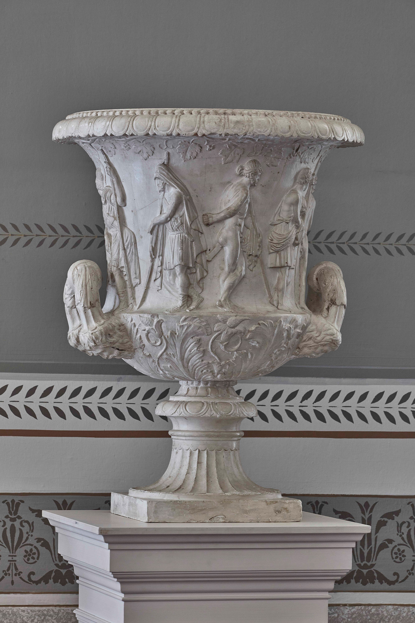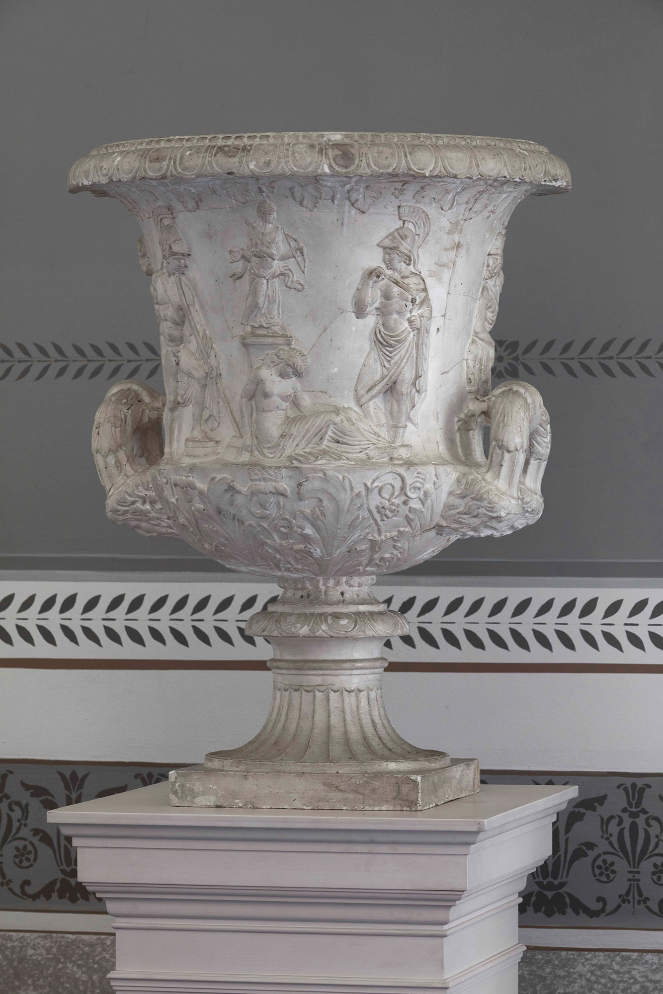 Coppia di grandi vasi a cratere "Medici". Gesso modellato a calco. Arte neoclassica italiana del XIX secolo I due vasi sono derivati in forma ridotta dal monumentale cratere marmoreo neoattico, alto circa 170 cm, conservato già dal '500 nelle collezioni di antichità della Villa Medici a Roma ed è decorato con scene che probabilmente raffigurano guerrieri achei a convegno a Delfi prima di intraprendere la guerra di Troia nel 1780 venne infine trasferito nelle gallerie degli Uffizi dove è tuttora custodito., altezza cm 75, diametro cm 58, Galleria Mossini, Mantova