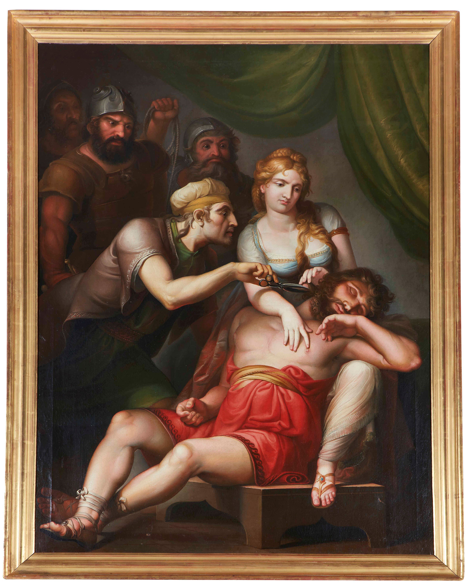 Segismondo Ribò y Mir (1799 Barcellona-1854 Barcellona), Susanna e i vecchioni e Sansone e Dalila coppia di dipinti, in cornici dorate, W. 110 - H. 150 cm, Guido Bartolozzi Antichità, Firenze, Recano firma al retro: Ribò y Mir Segismondo