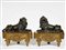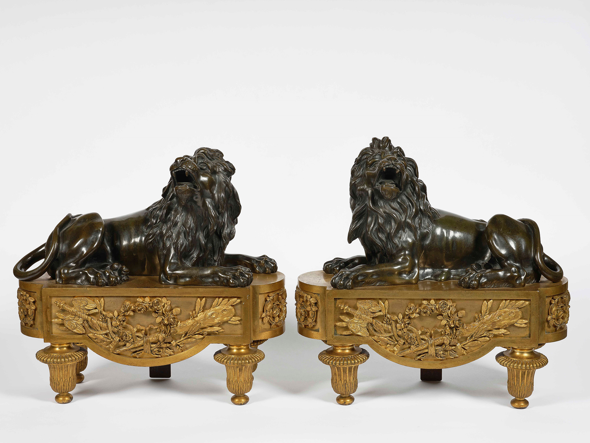 Coppia di alari da camino in bronzo dorato e patinato. XIX secolo Raffiguranti due leoni accovacciati e ruggenti, W. 40 - D. 18 - H. 39,5 cm