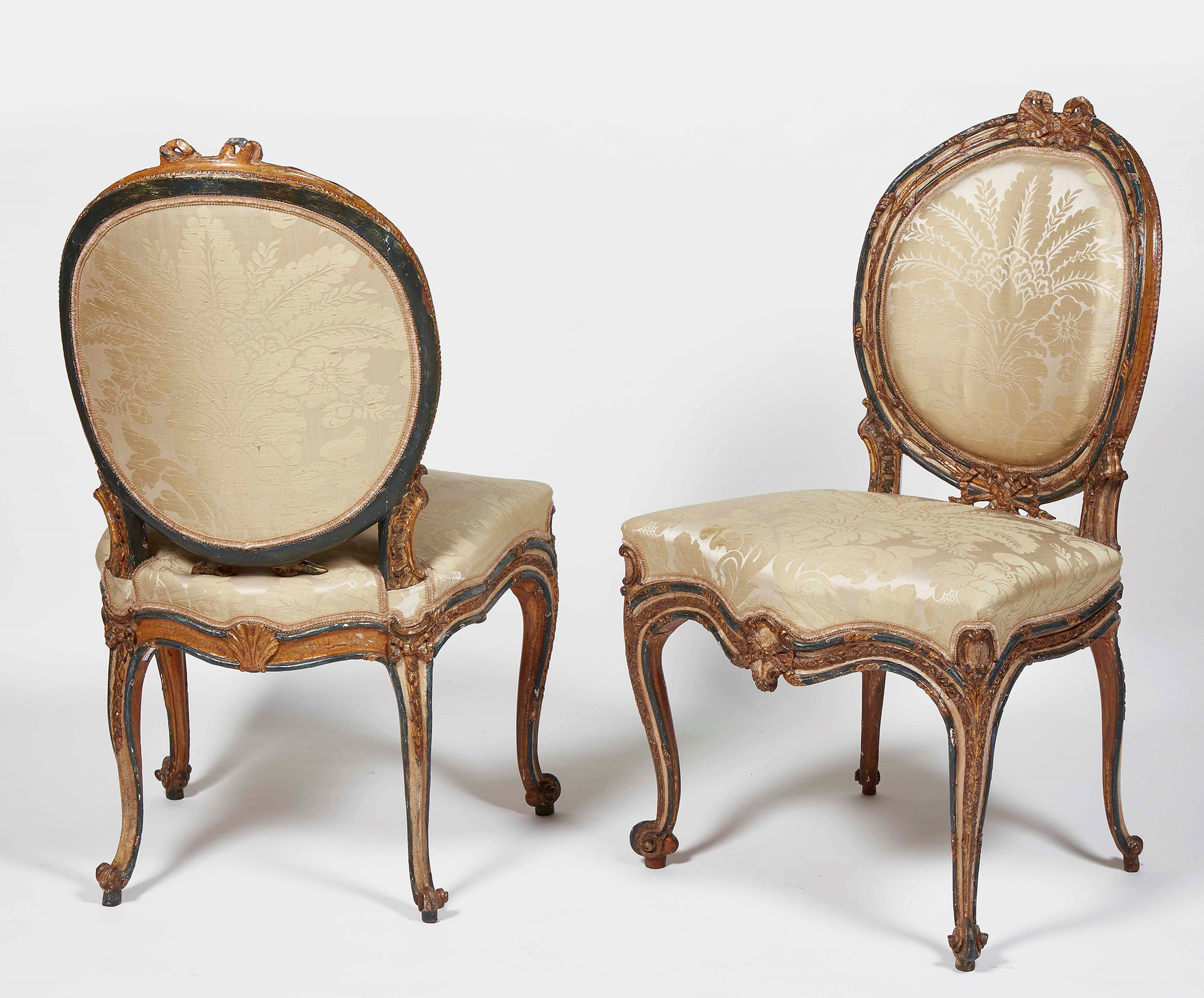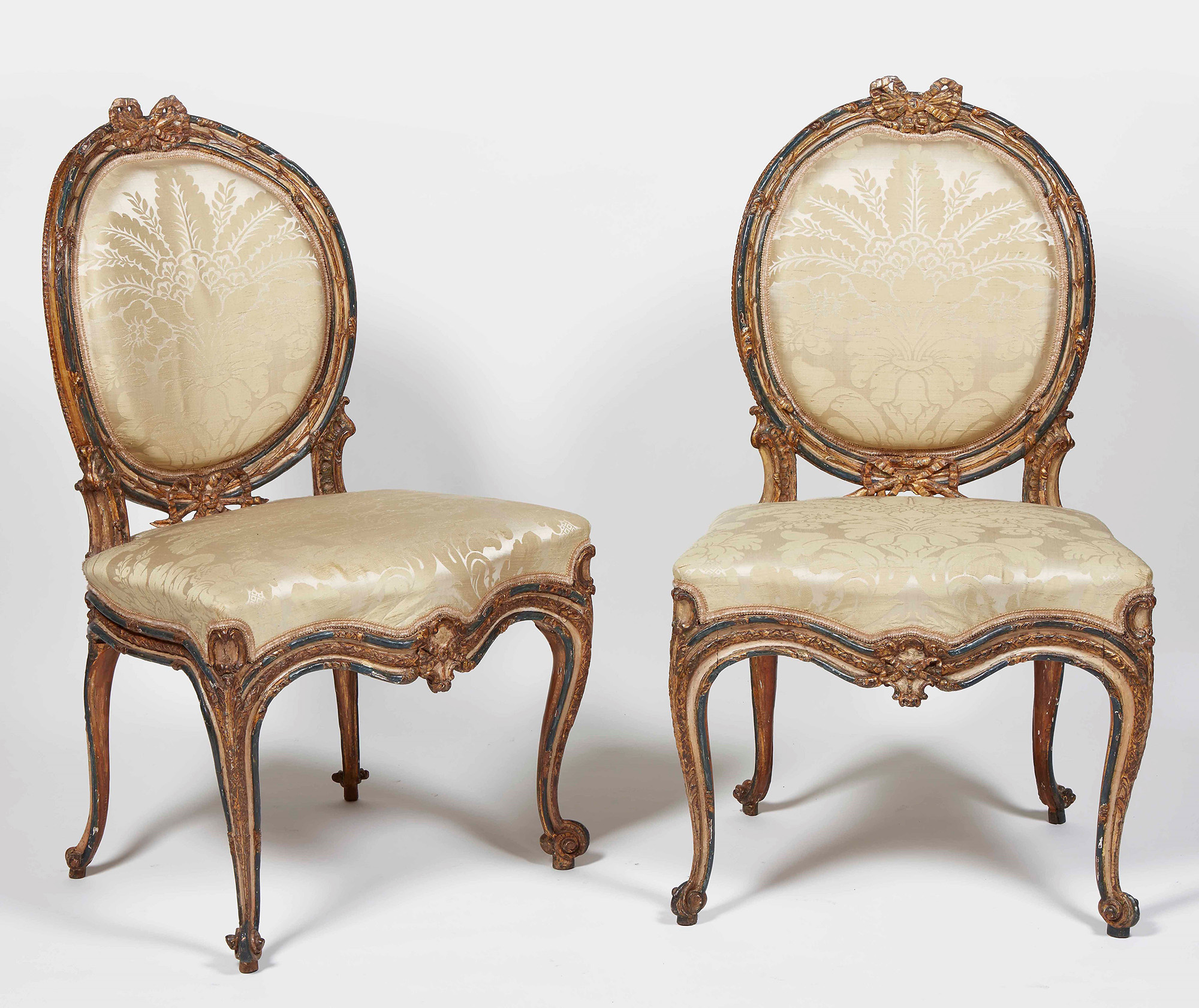 Gruppo di quattro sedie Luigi XV in legno finemente intagliato, decorate in lacca avorio e blu e lumeggiate in oro. Italia meridionale ultimo quarto XVIII secolo Gambe mosse, spalliere ovali a giorno e sedili imbottiti, W. 58 - D. 50 - H. 102 cm, Guido Bartolozzi antichità, Firenze