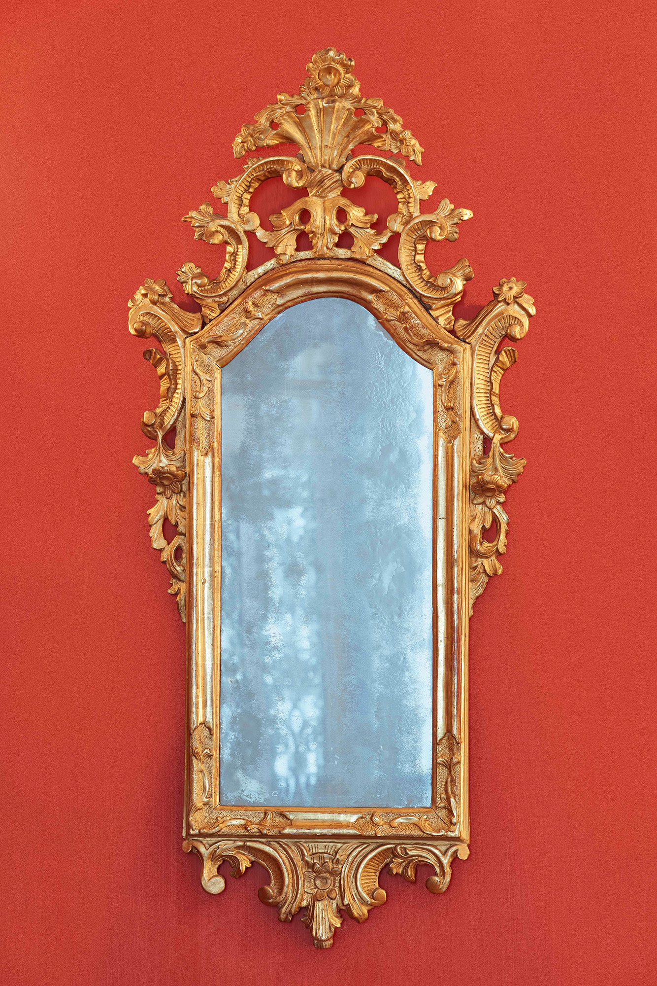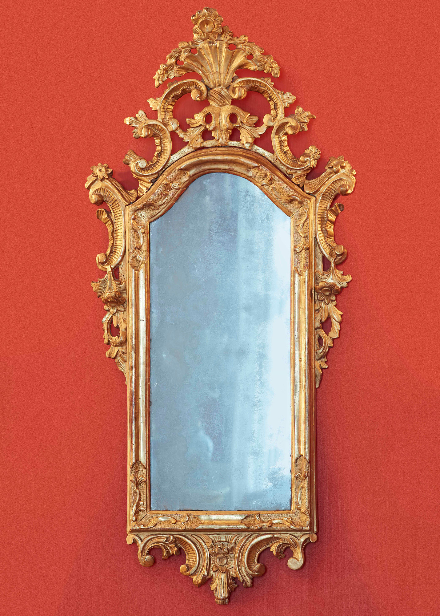 Coppia di specchiere in legno intagliato e dorato. Fine XVIII secolo Decori a volute fogliacee e fiori, cimasa traforata, W. 57 - H. 112 cm, Antichità Roberto Camellini, Sassuolo, Modena