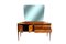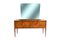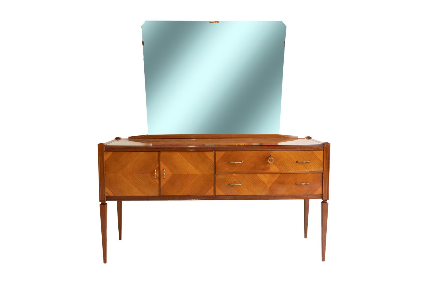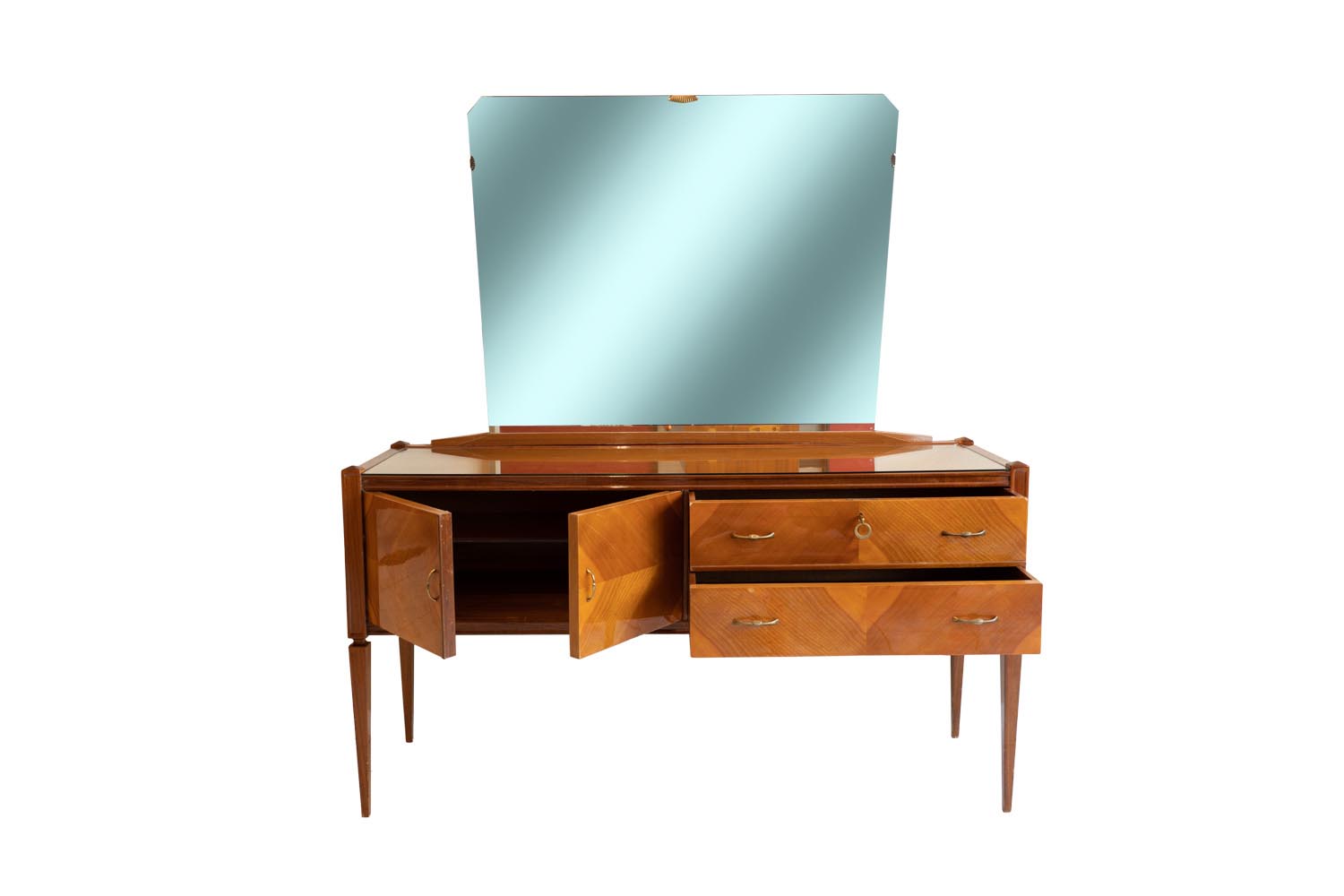 Struttura in legno e impiallacciatura in legno di noce, piano in vetro (piccola sbeccatura) fronte a due cassetti e due sportelli