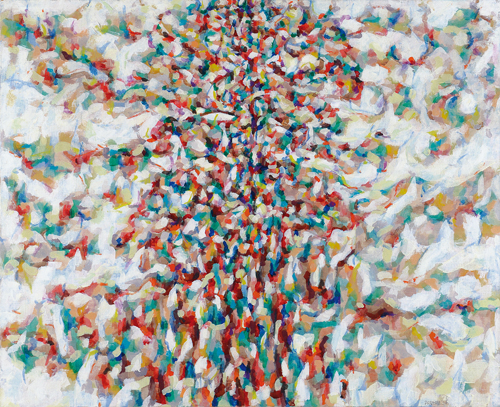 PIERO DORAZIO Roma 28/06/1927 - Todi 17/05/2005  Tante diversità tante passioni, 1956 olio su tela cm. 80x100, firma in basso a destra, titolo, firma, anno ed etichette della Galleria Anfiteatro Arte (PD), della Galleria Marlborough (Roma), dell'esposizione Arte Fiera Bologna 2011 e della Galleria Gustav Knauer (Dusseldorf) al retro, opera registrata presso l'Archivio Piero Dorazio come da certificato con foto allegato. Bibliografia: -1976, Piero Dorazio, San Gallo G. Ungaretti al n° 9, pagina 39. -1977, Dorazio, Venezia, M. Volpini Orlandi al n° 199.