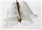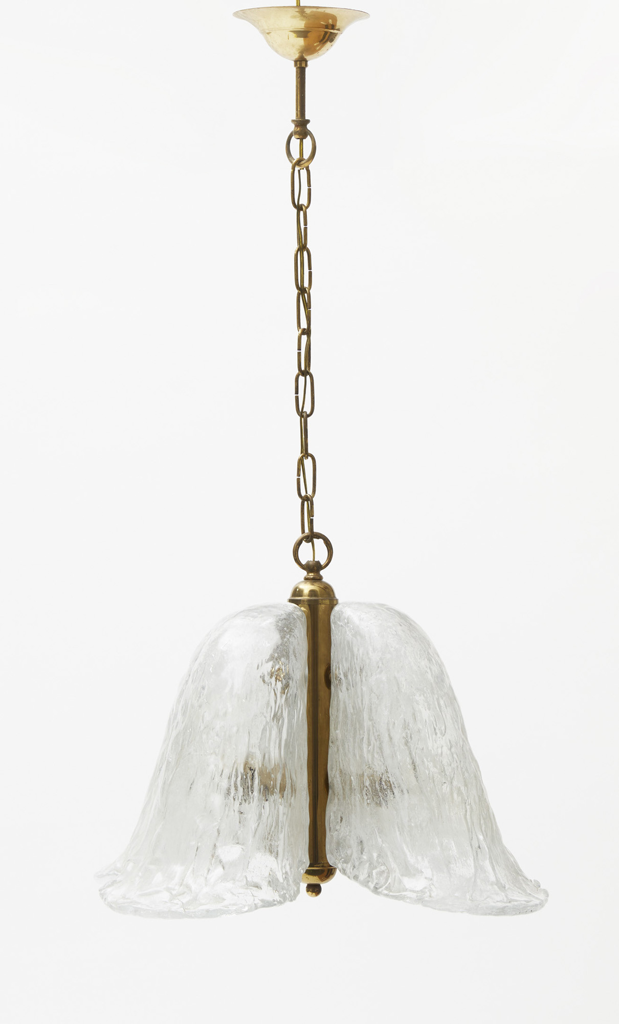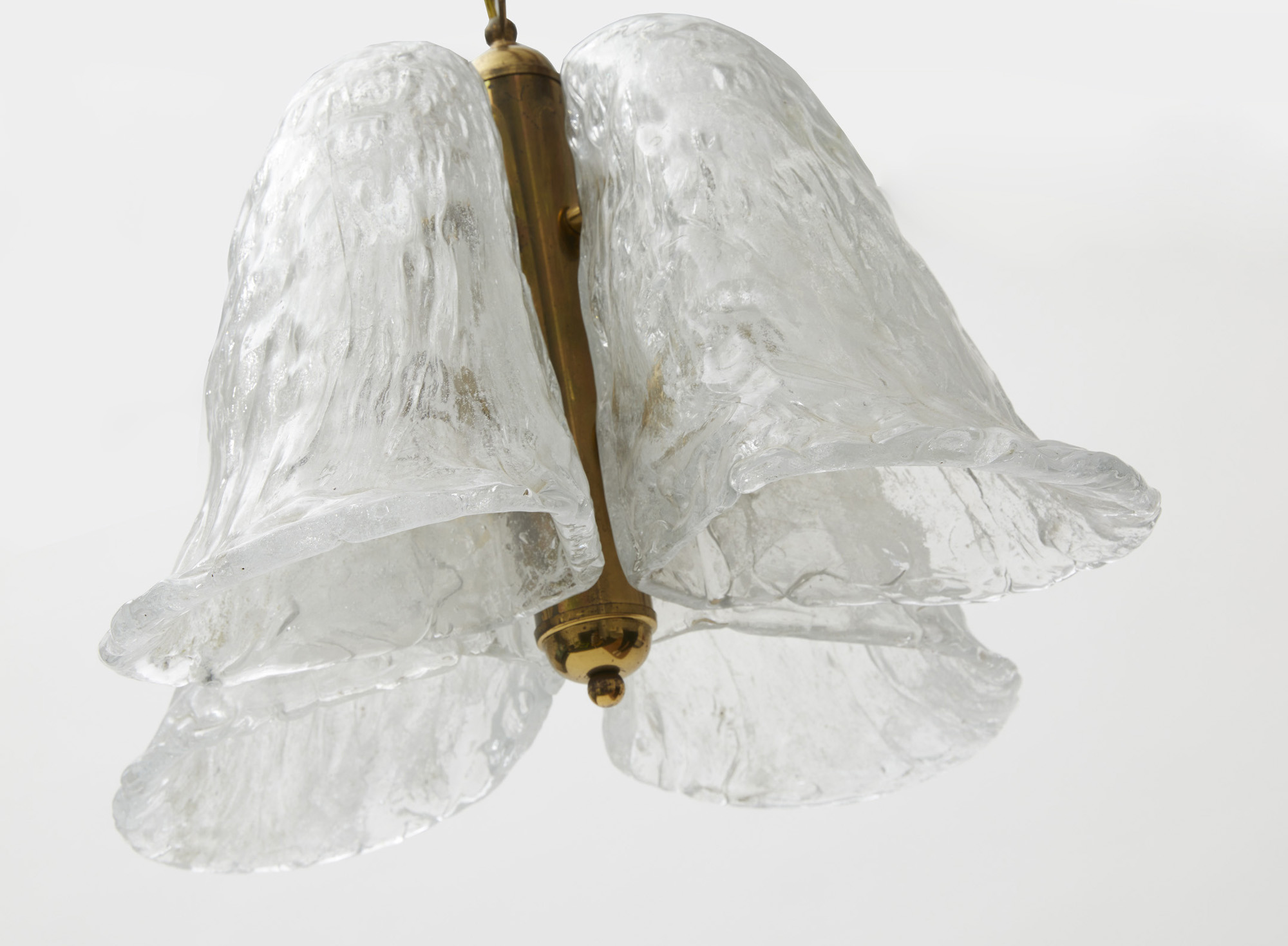 Lampadario con struttura in ottone e quattro diffusori in vetro bullicante bianco.