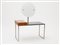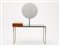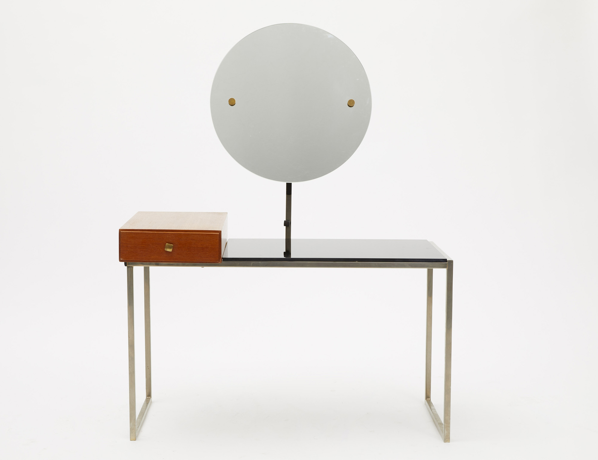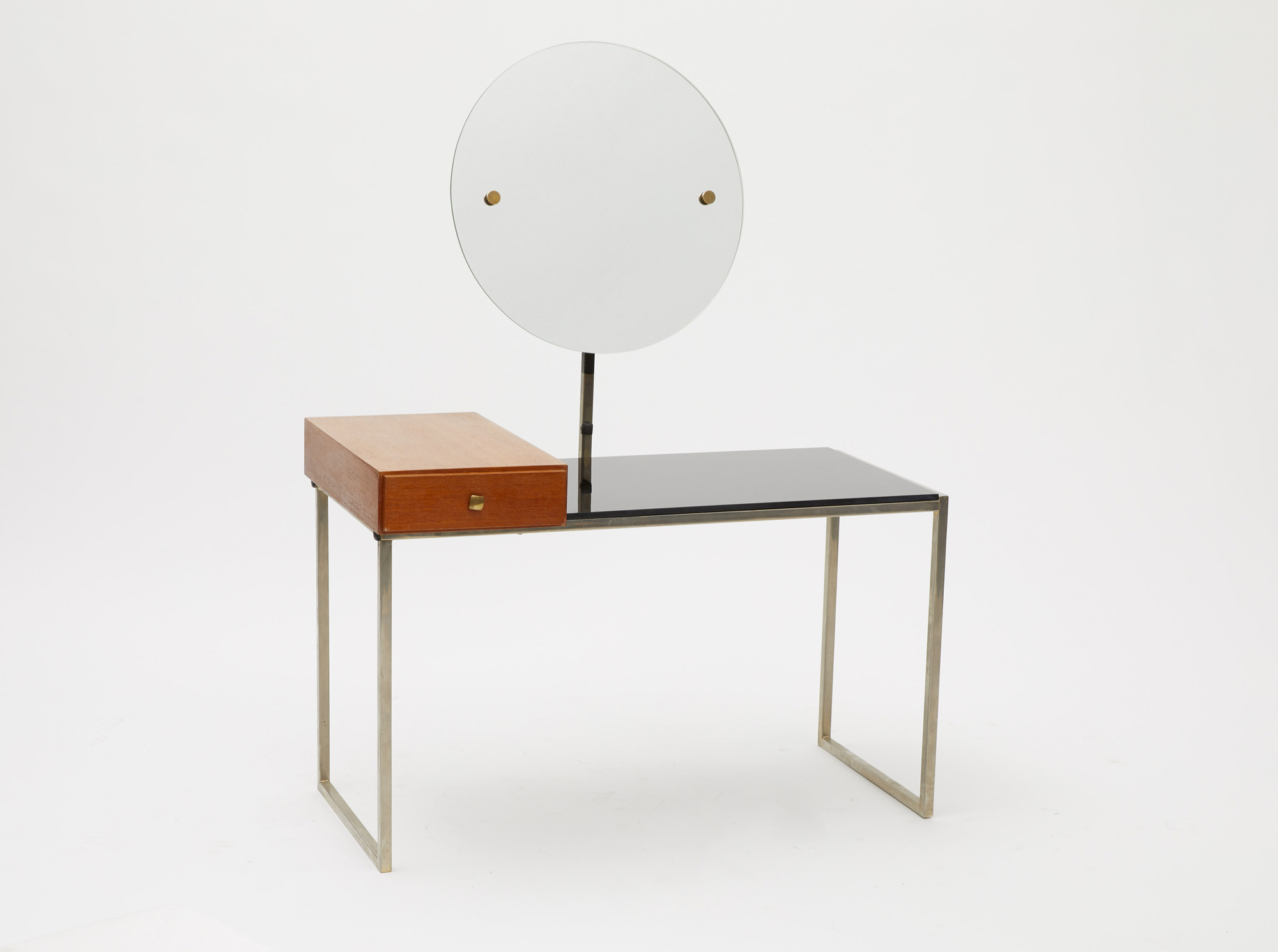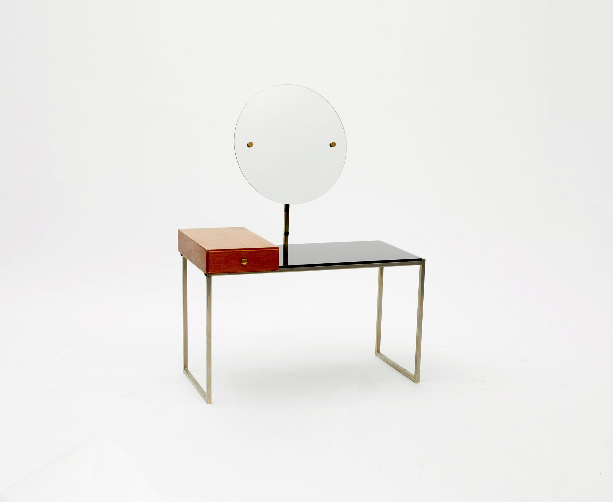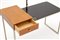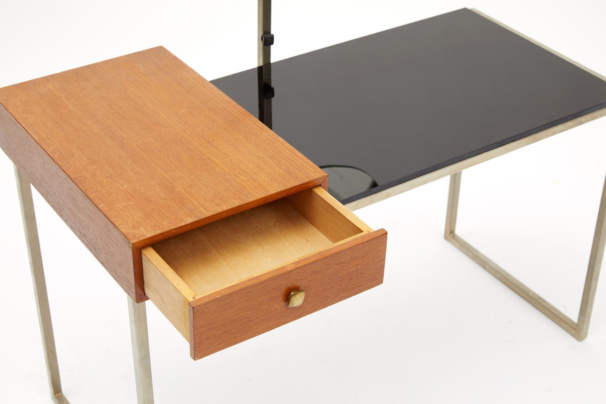 Piccola toilette in metallo costituita da un piano in vetro nero su cui poggia un cassetto in legno posto lateralmente.