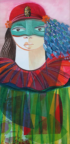 VITTORIOMARIA DI CARLO S. Marco in Lamis (Fg) 1939 Figura in maschera, 1995 olio su tela cm. 50x25, firma in basso a sinistra, firma e anno al retro, dichiarazione d'autenticità dell'artista su foto, fotografia ritraente l'opera e l'artista allegata, certificato della Arte Club allegato.