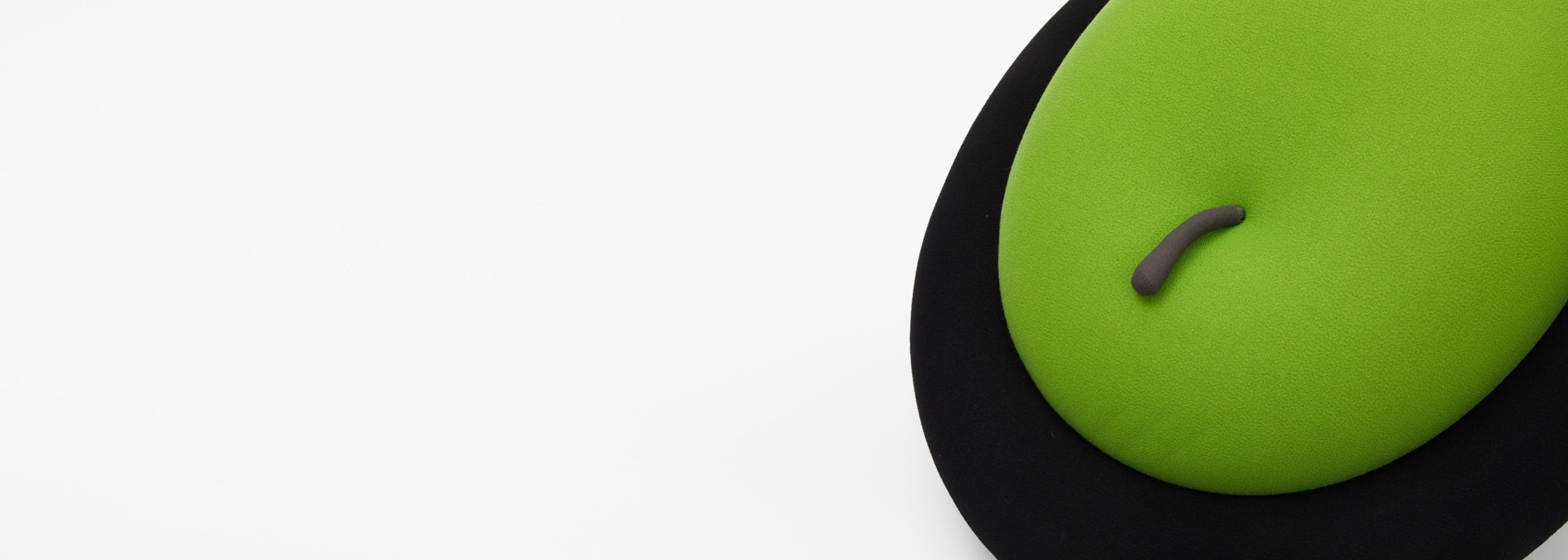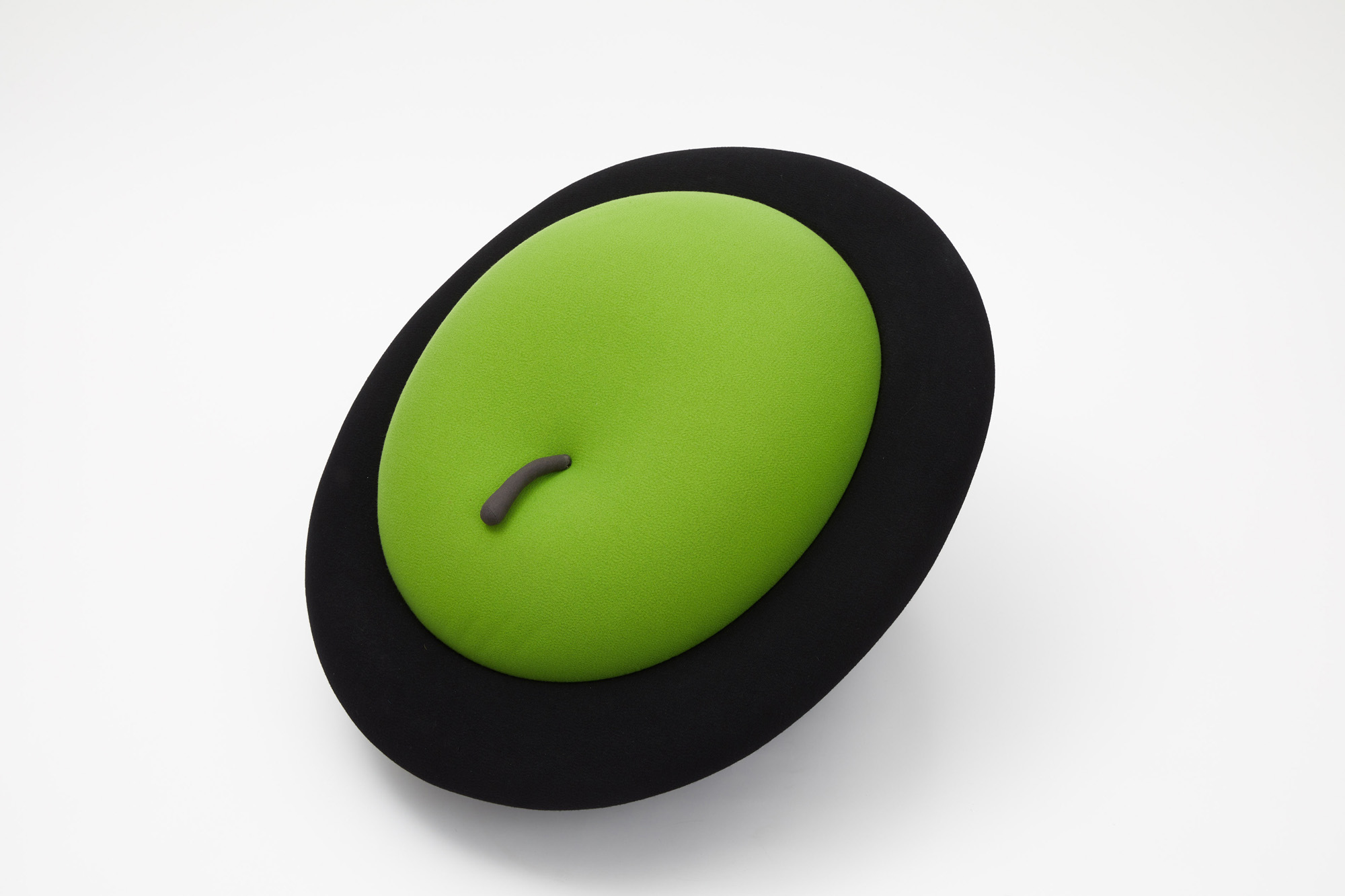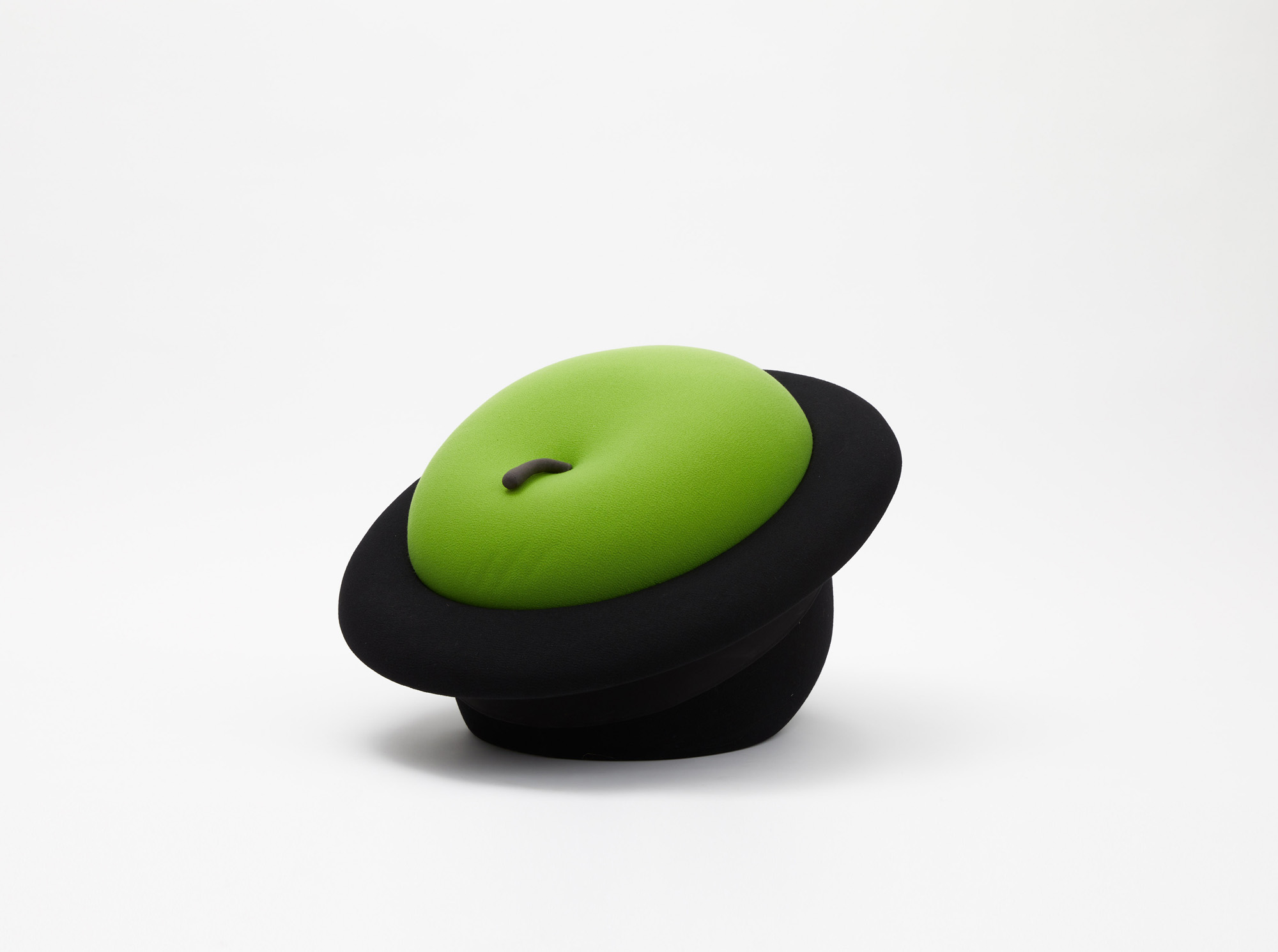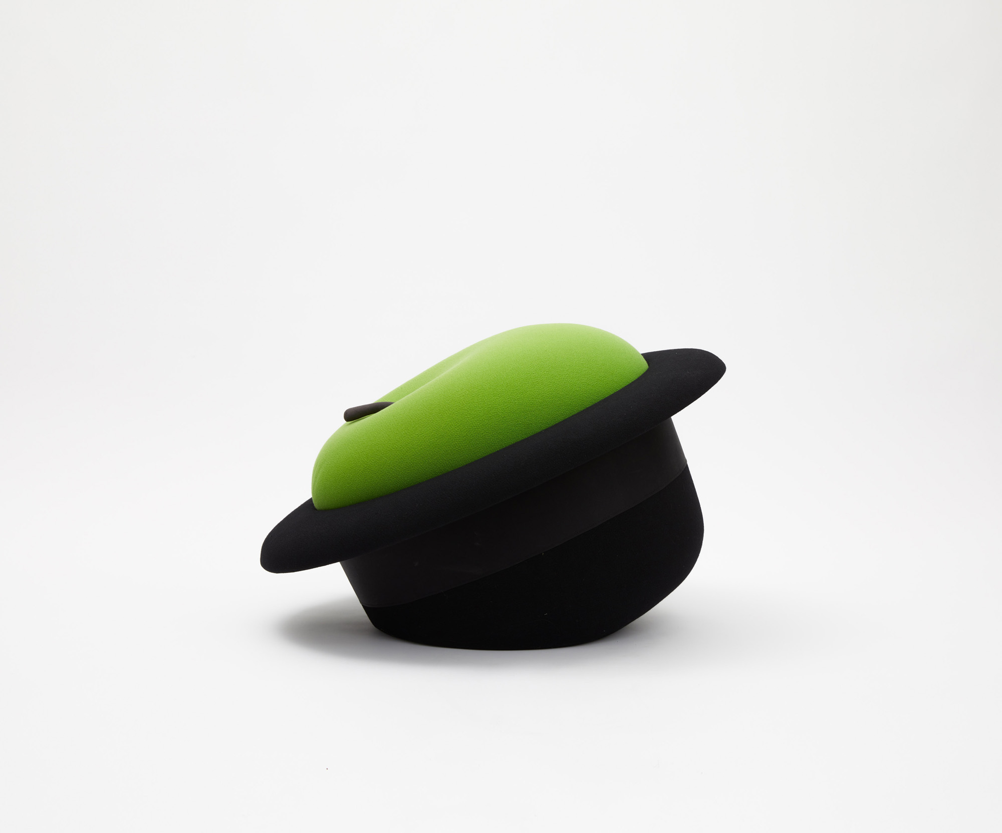 Poltrona MAgriTTA con struttura in fibra di vetro ricoperta in tessuto nero, seduta in schiuma di poliuretano espanso ricoperta di tessuto verde.