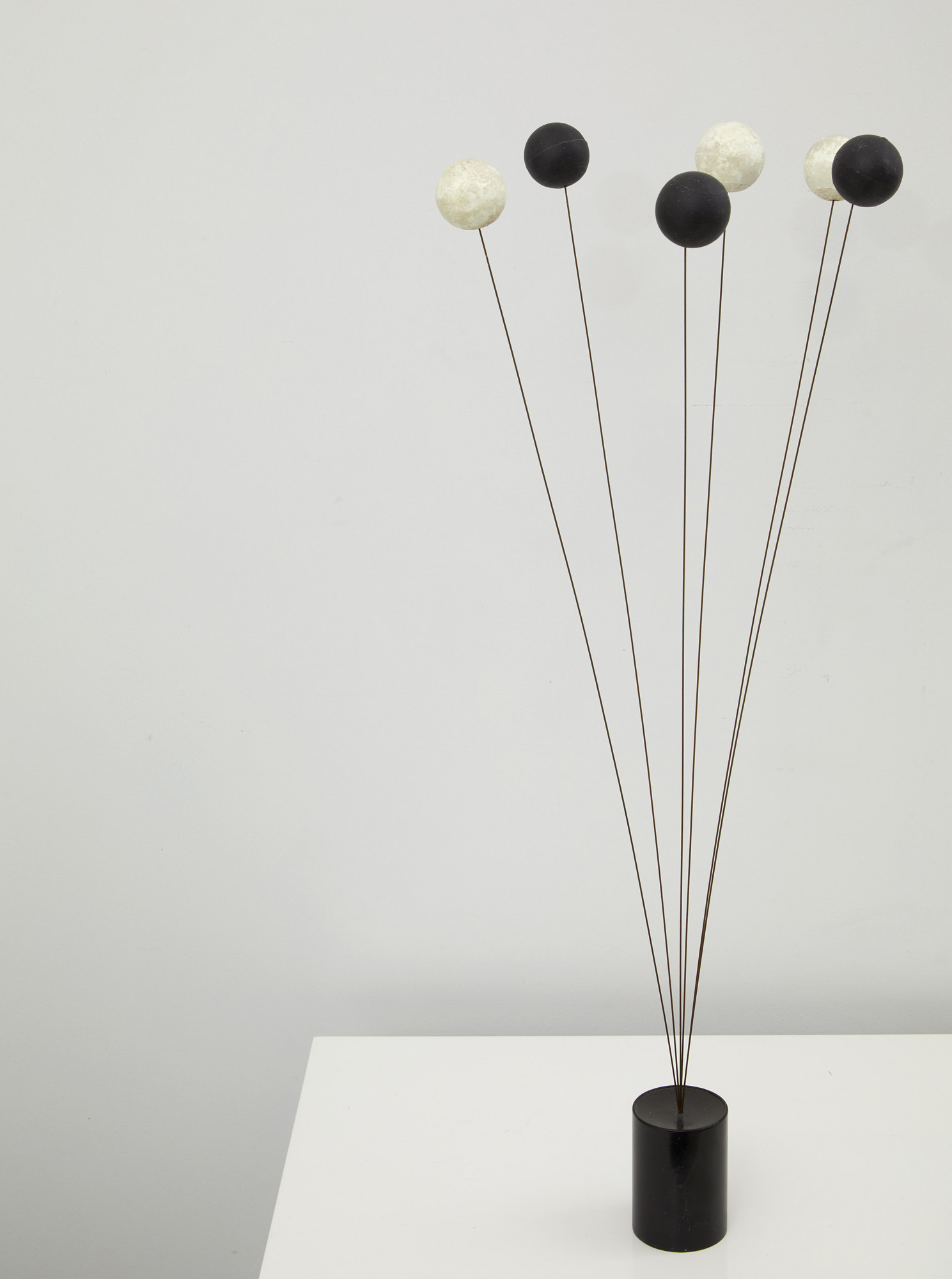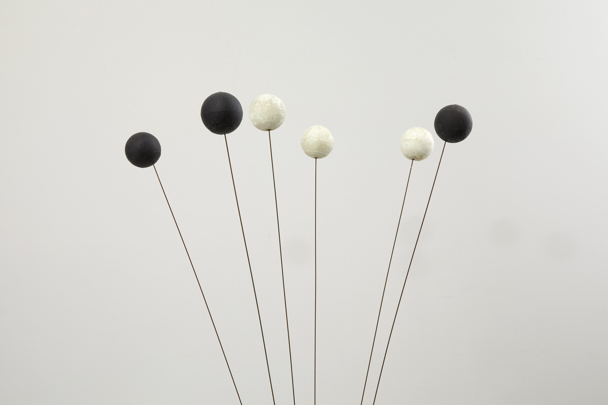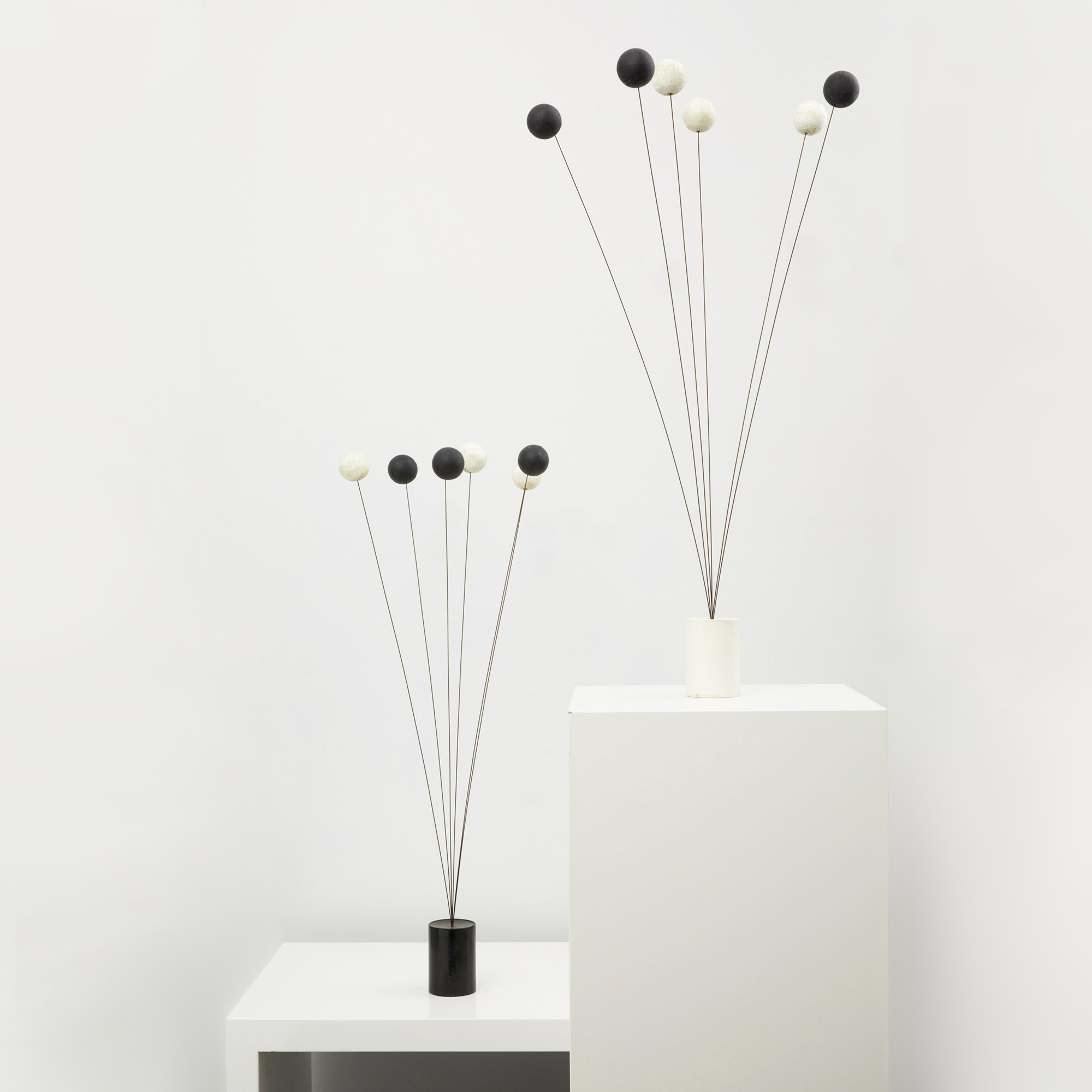 Il lotto si compone di due elementi decorativi costituiti da una base cilindrica in metallo bianco e nero dalla quale si diramano fili di ferro culminanti in sfere in polistirolo bianche e nere.
