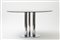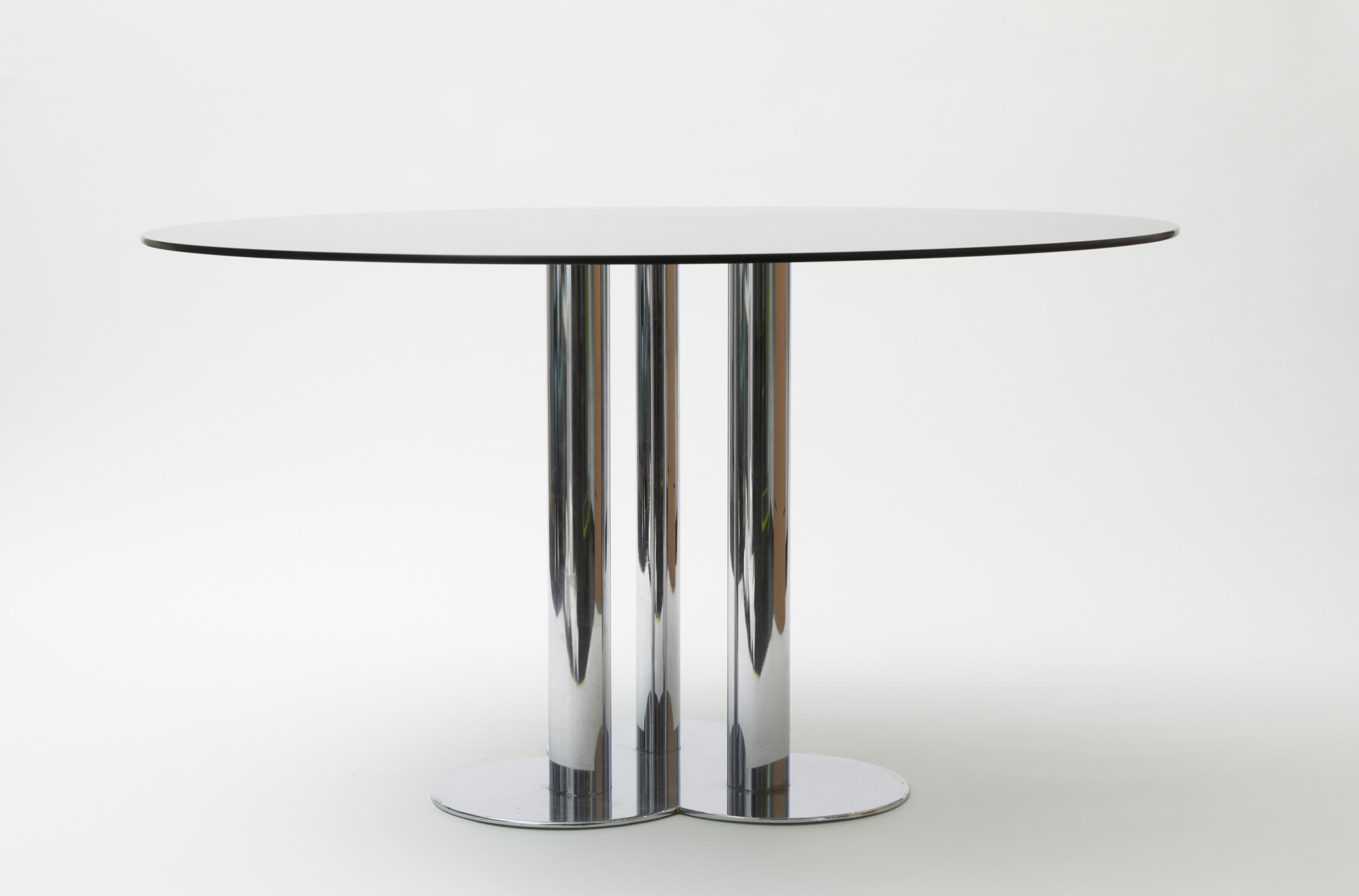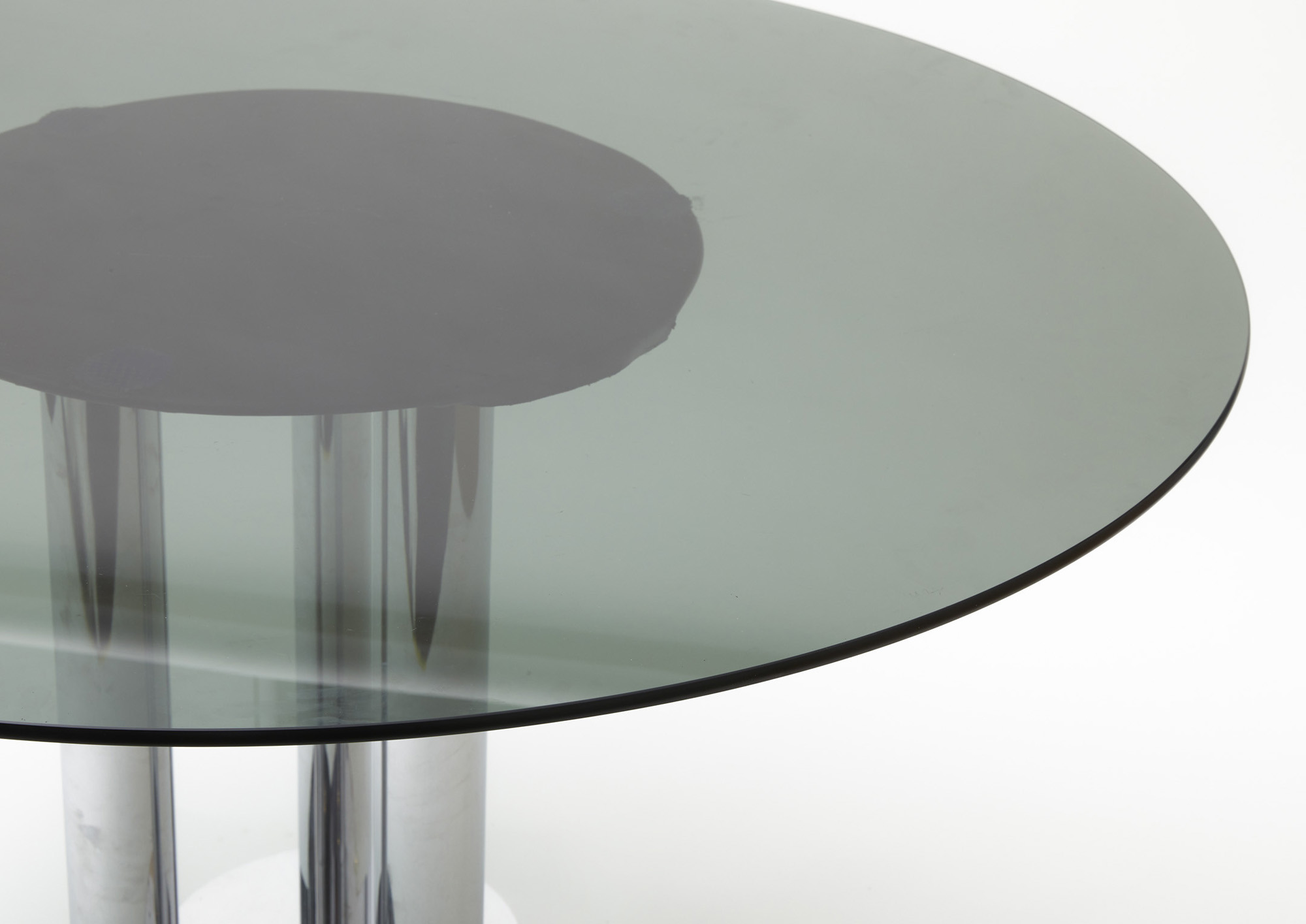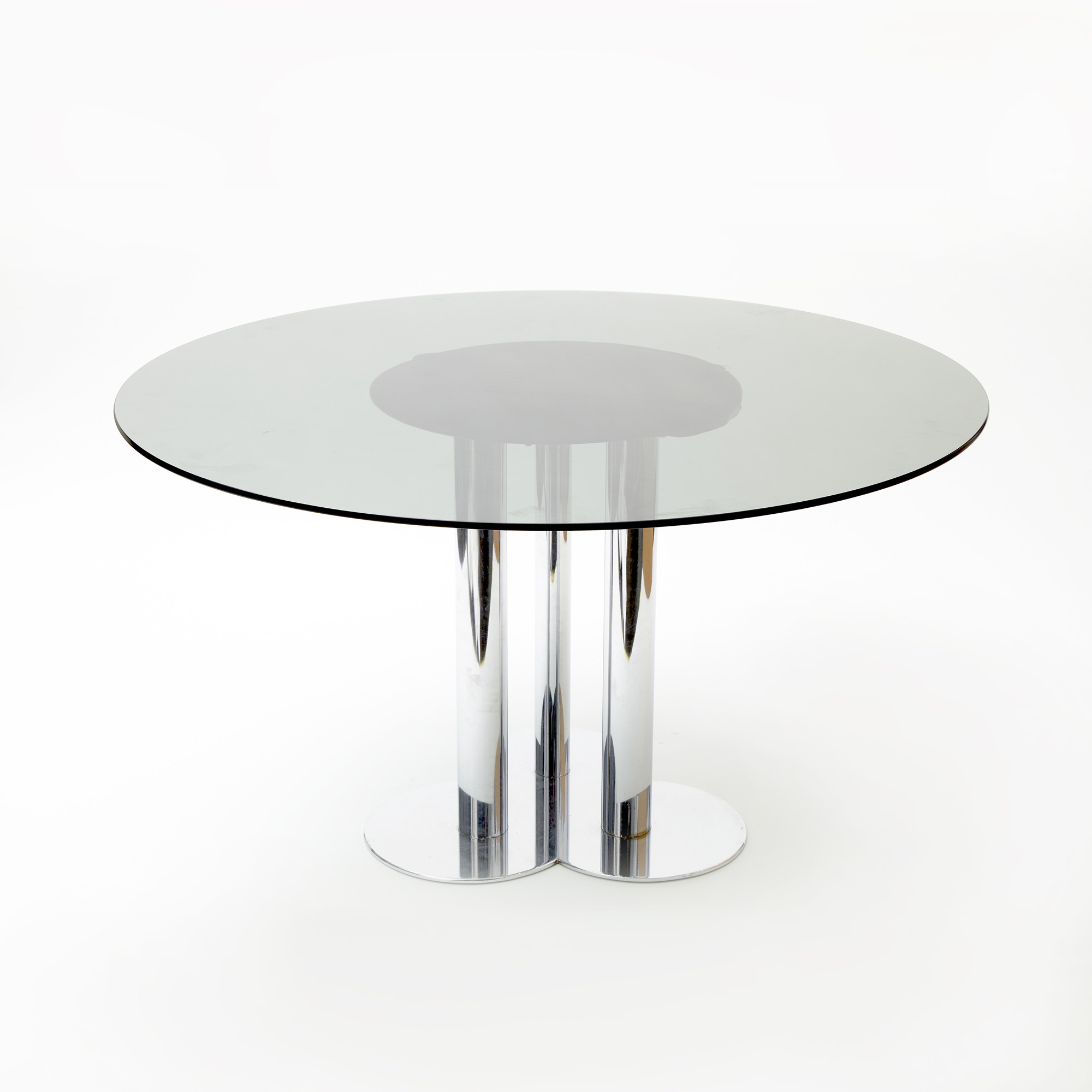 Tavolo "Trifoglio", mod. TP. 121, composto da un piano rotondo in cristallo fumé poggiante su supporto metallico cromato.