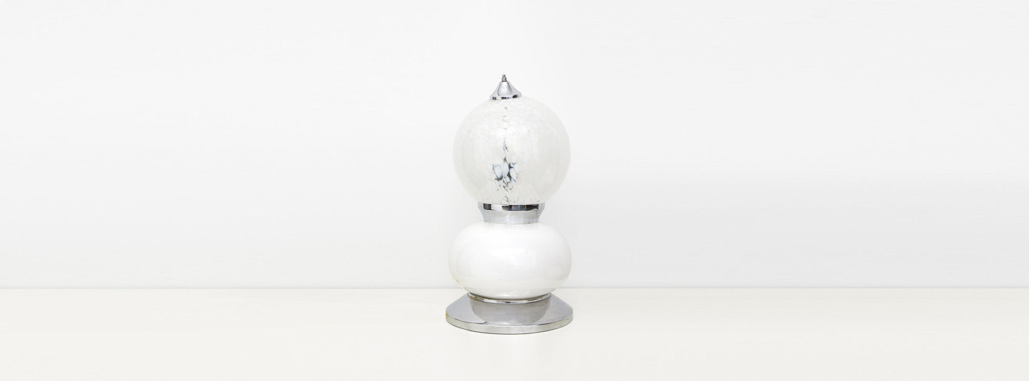 La lampada da terra con base rotonda in metallo cromato presenta doppio diffusore in vetro opalino e in vetro maculato.