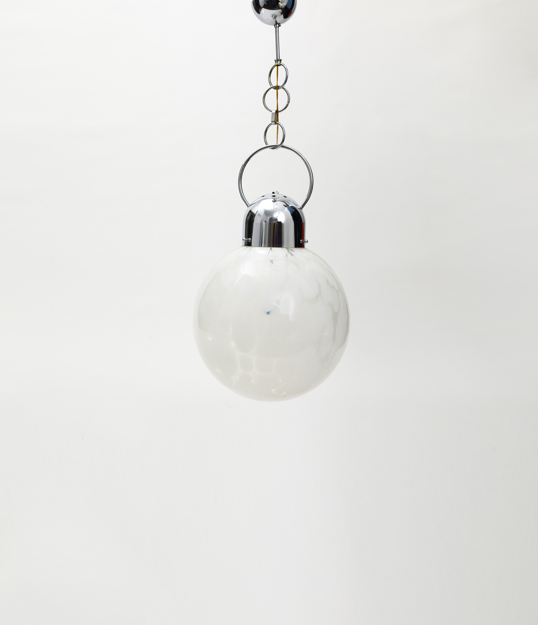 La lampada a sospensione con catena e rifiniture in metallo cromato presenta grande diffusore dalla forma sferica in vetro maculato.