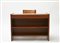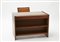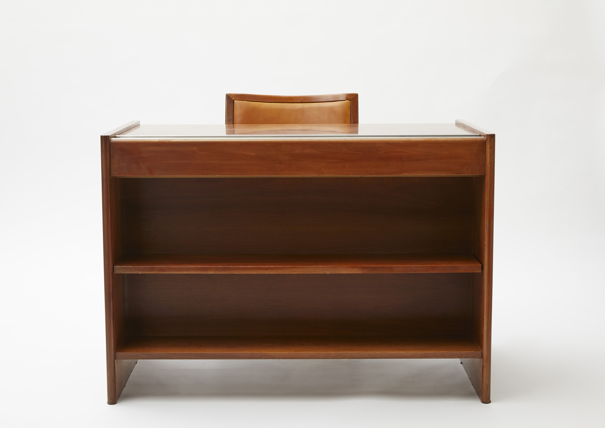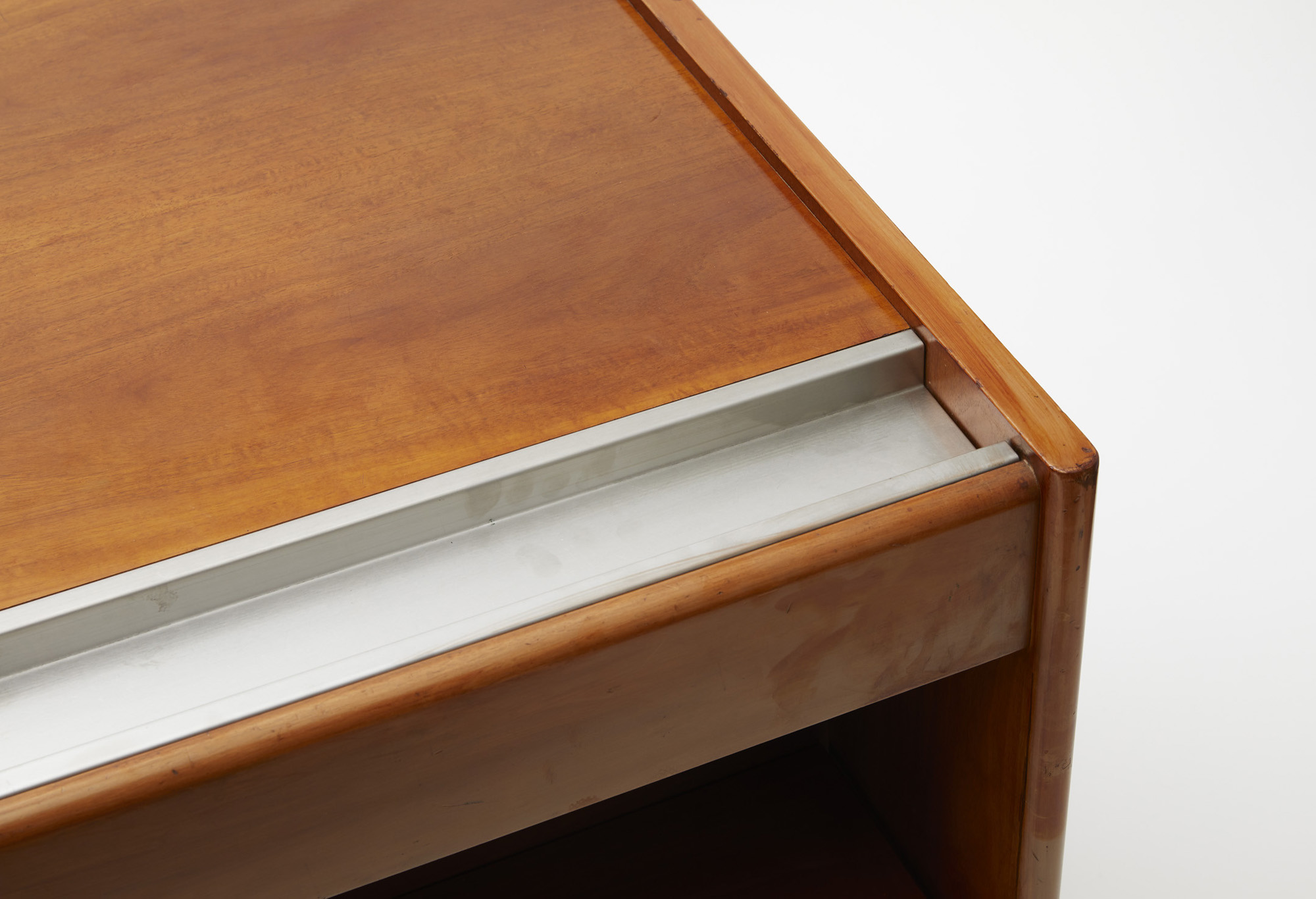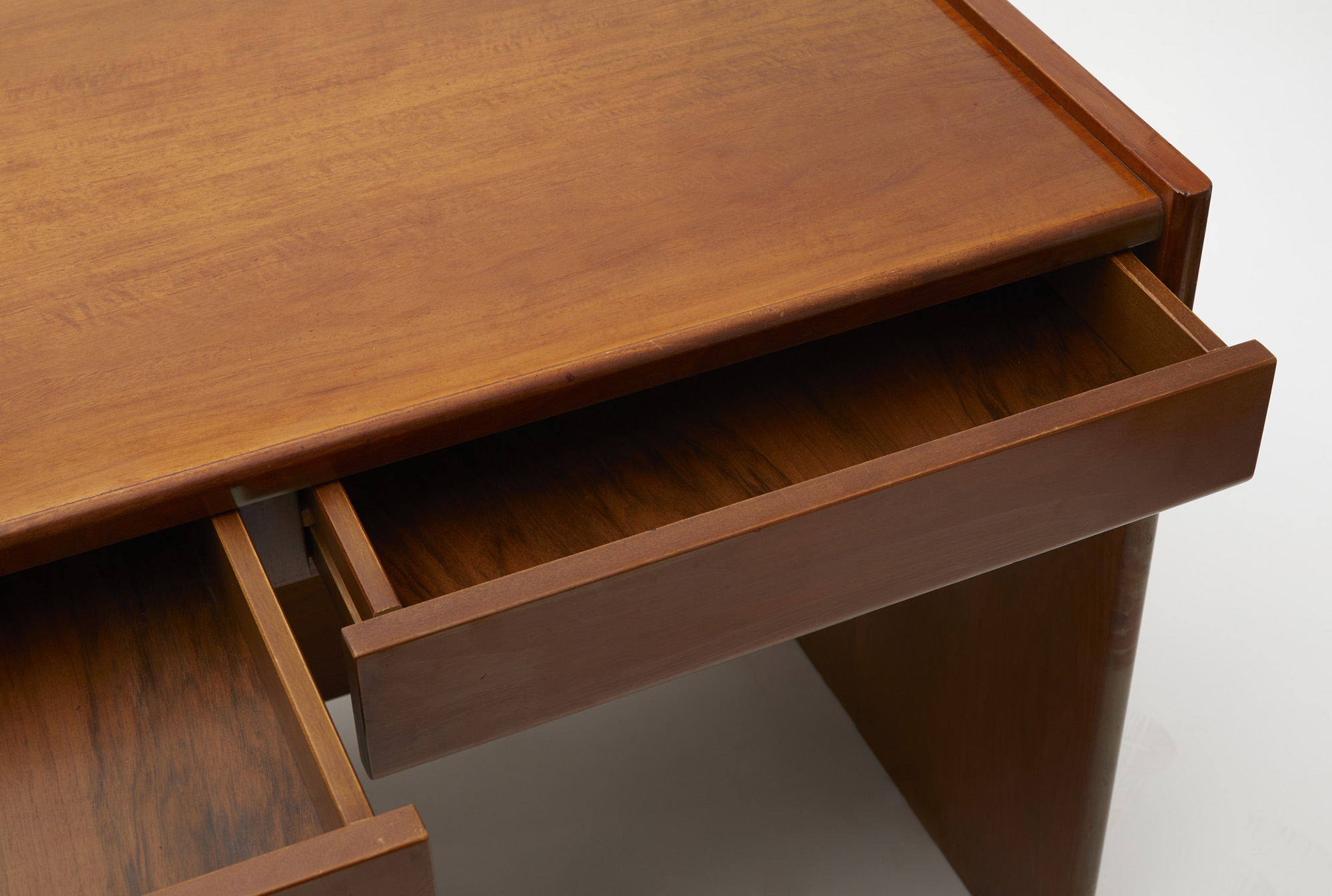 Scrivania da centro in legno dalla forma squadrata attribuita alla produzione di C&B; nella parte anteriore sono presenti doppi cassetti e ripiani nella parte posteriore.
