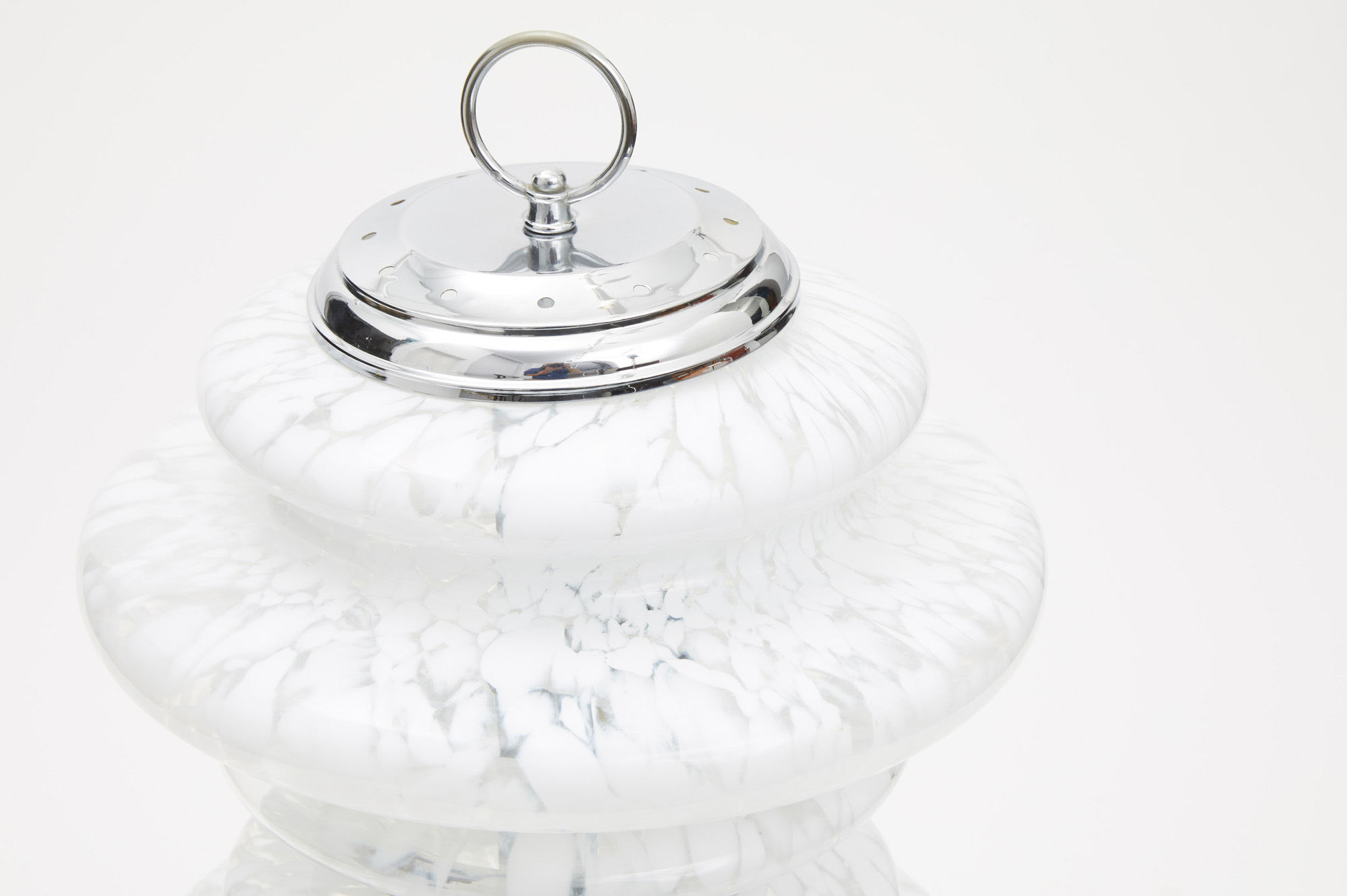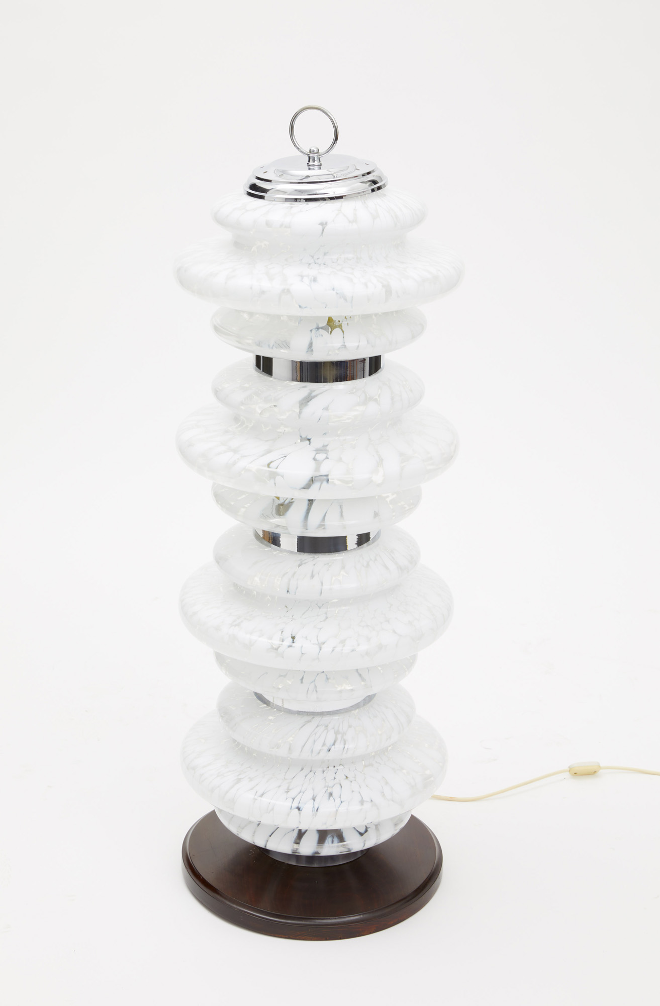Lampada da terra nello stile di Carlo Nason con base in legno e quattro diffusori in vetro maculato con rifiniture in metallo cromato.