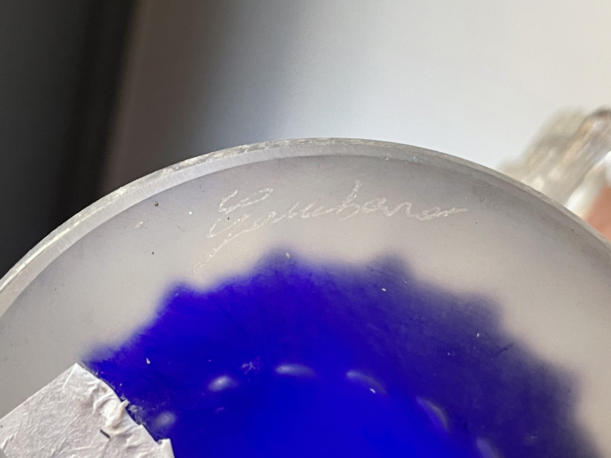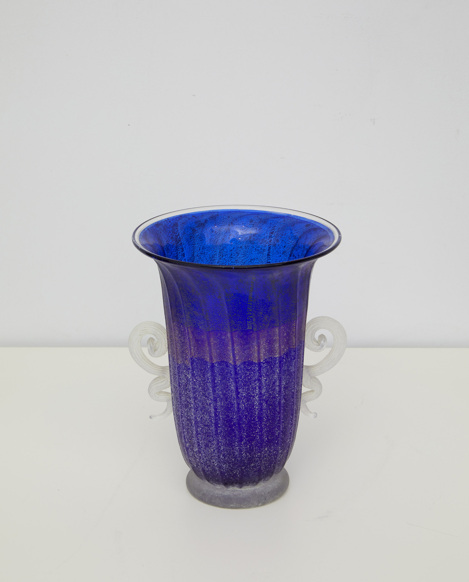 Vaso in vetro blu realizzato da Mario Gambaro con lavorazione a scavo ed inclusioni in foglia oro.
