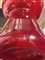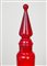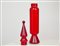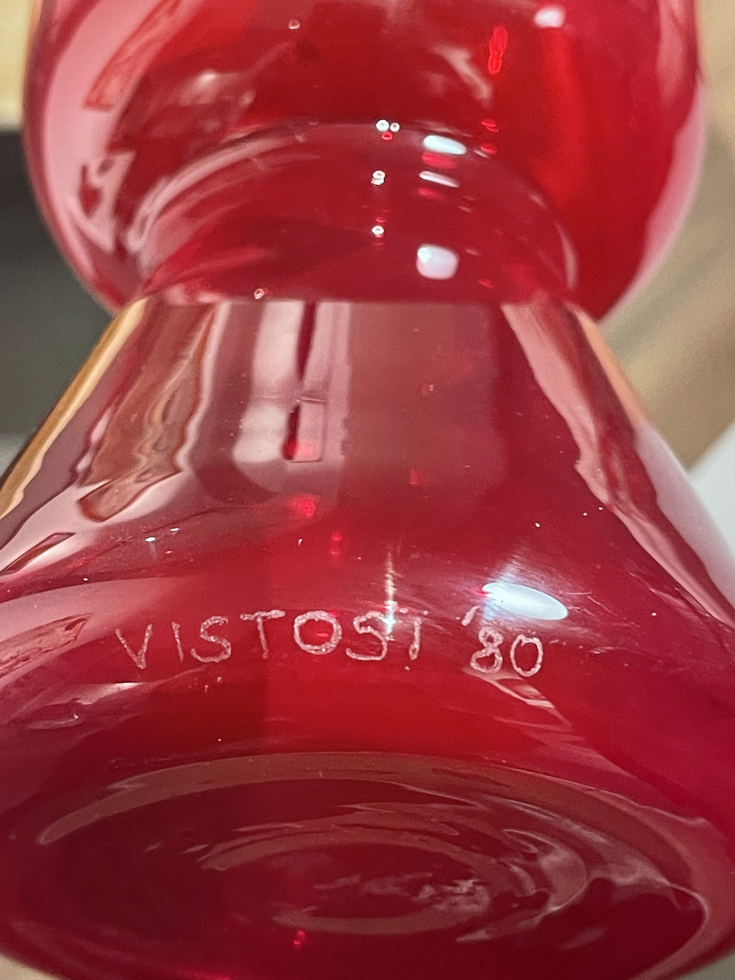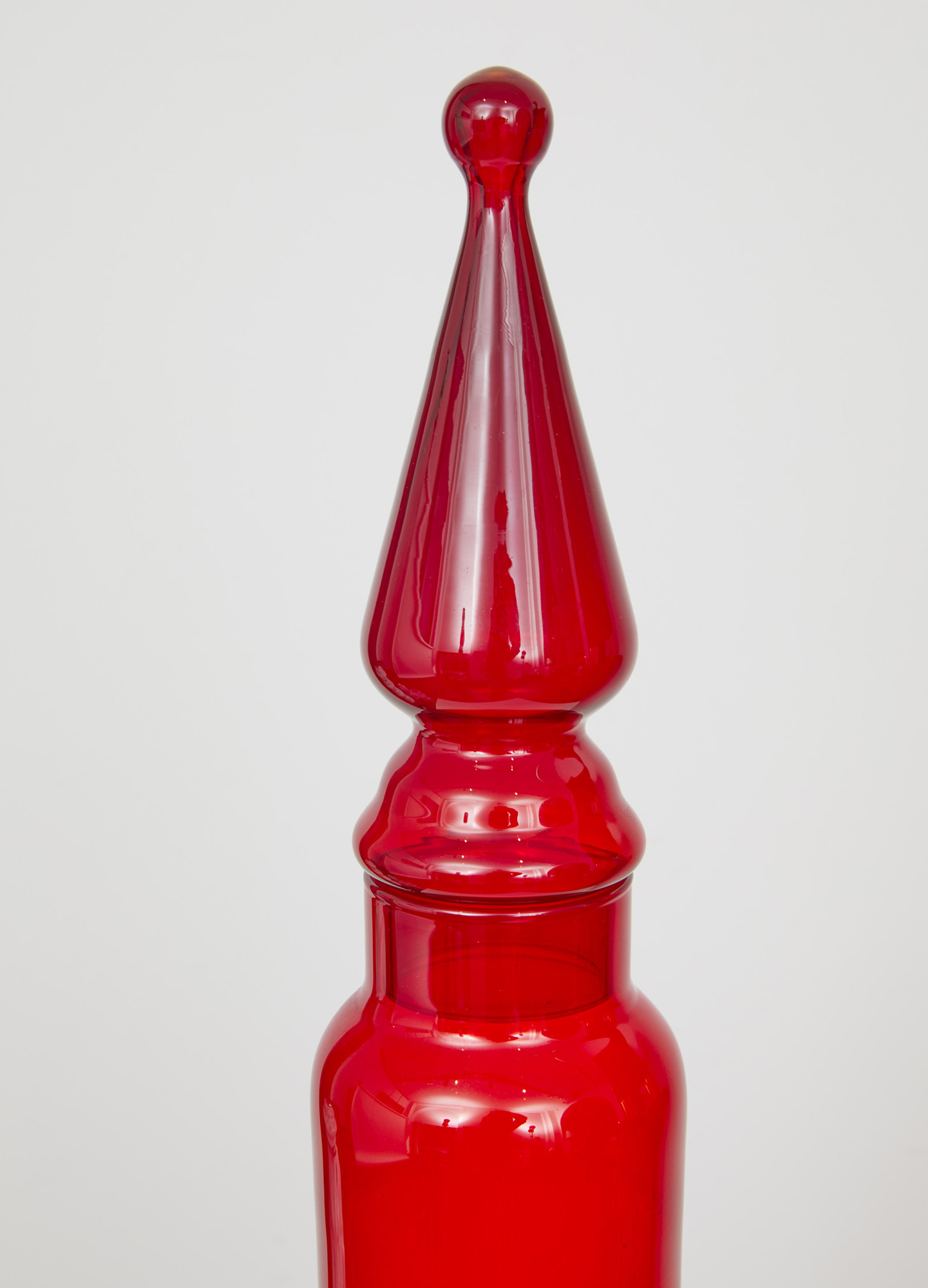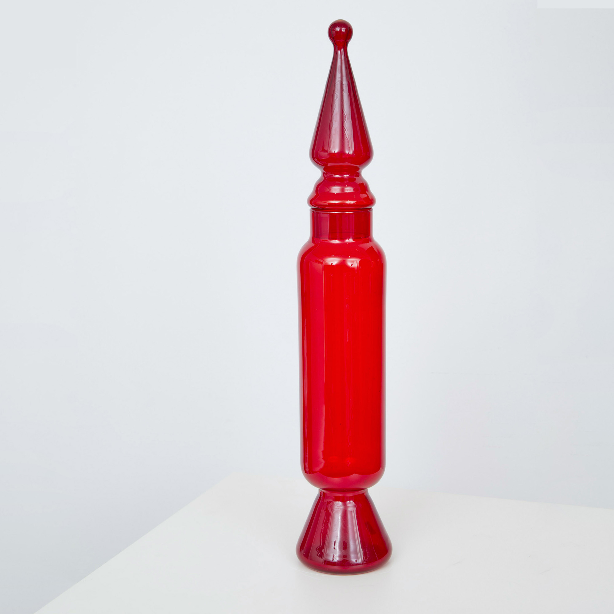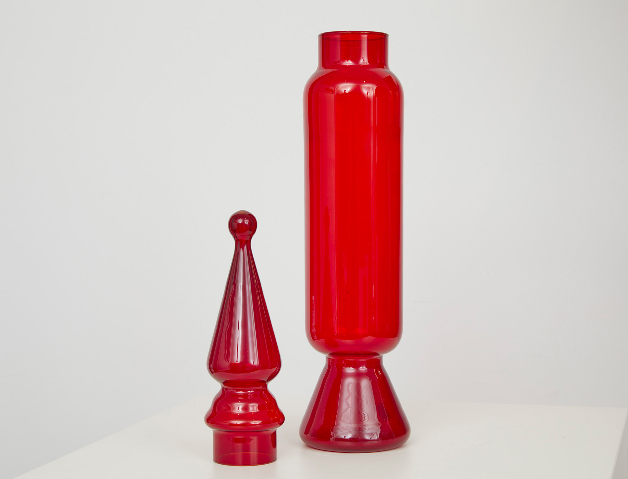 Vaso in vetro rosso dalla forma allungata con coperchio a cono realizzato da Vistosi.