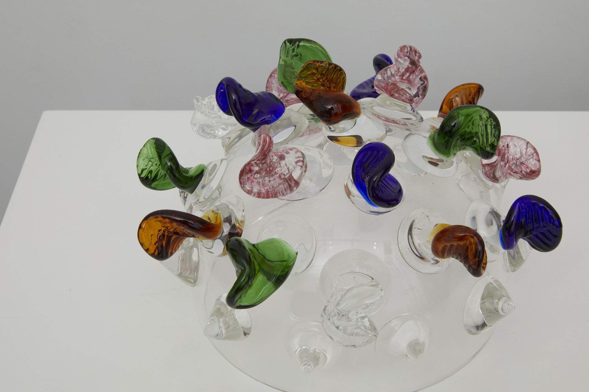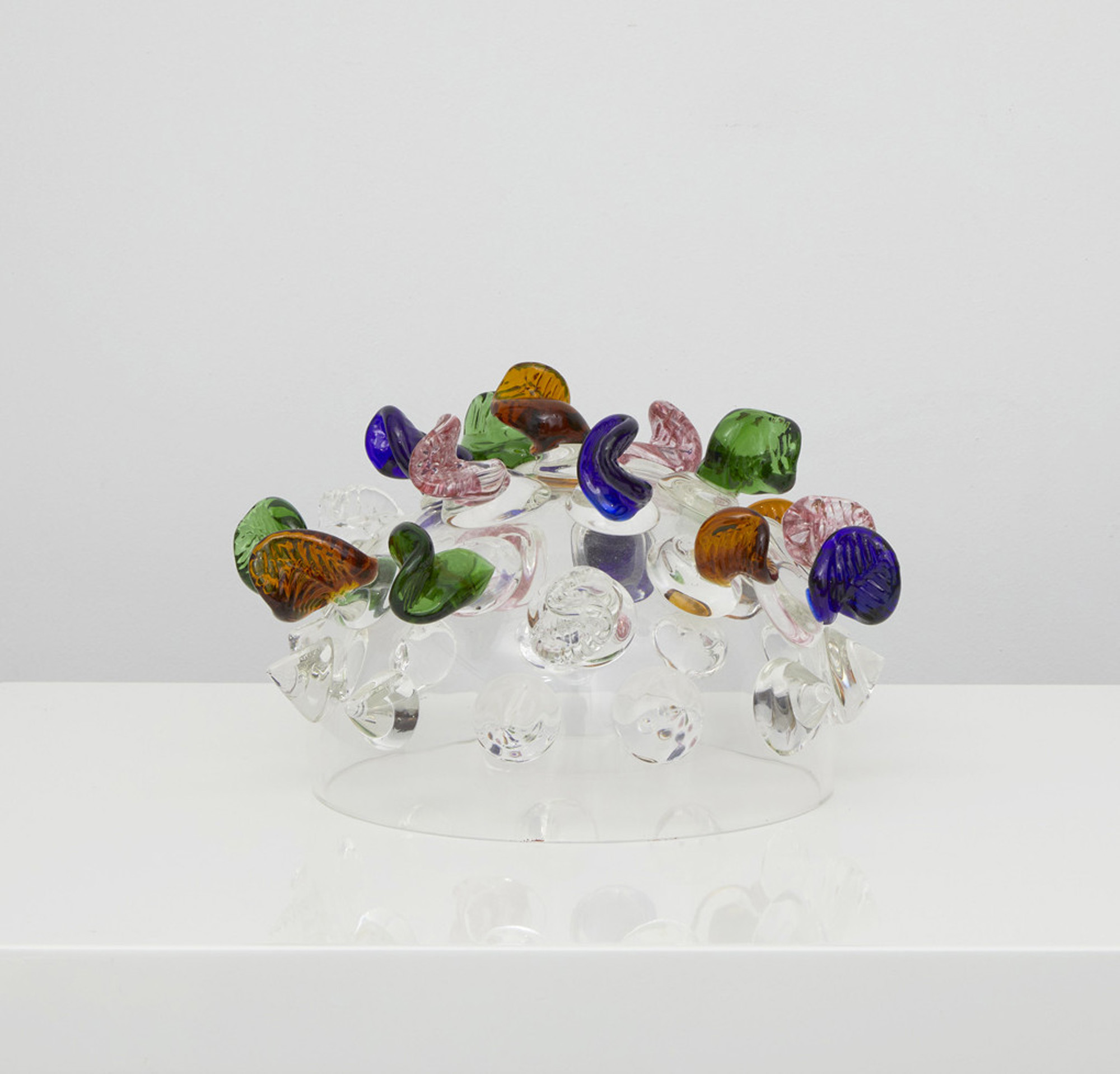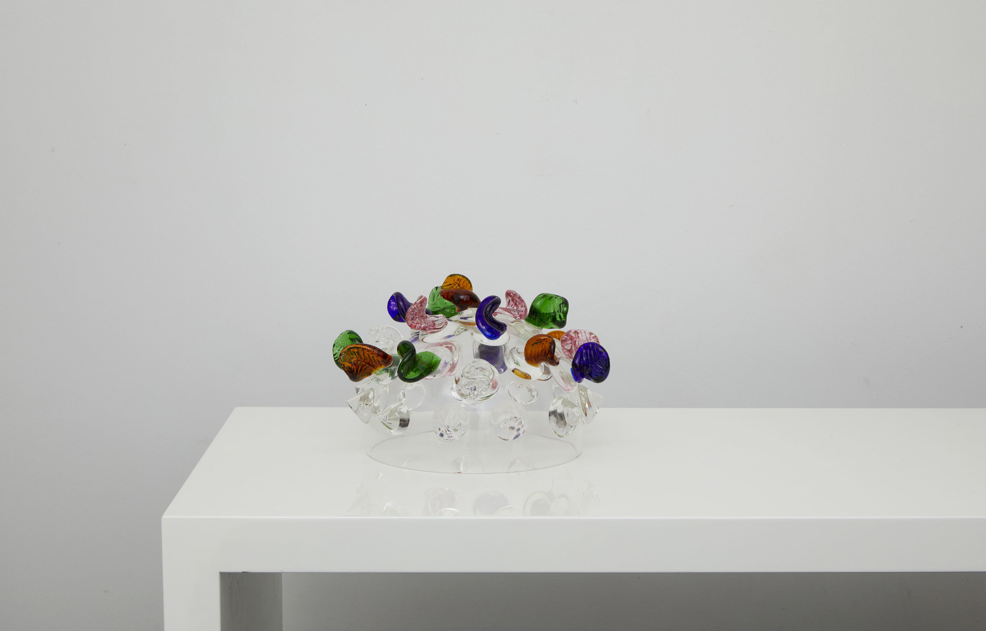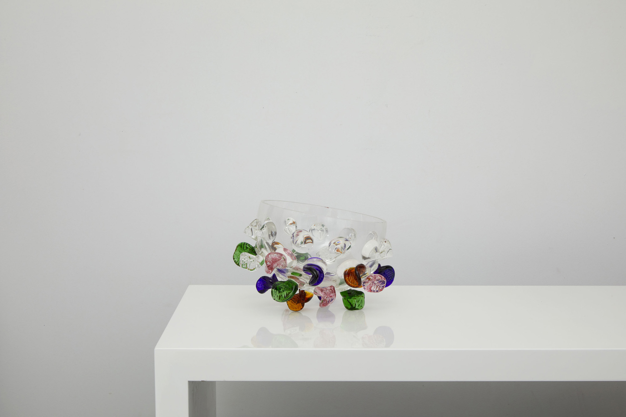 Centrotavola in vetro trasparente con punte colorate.
