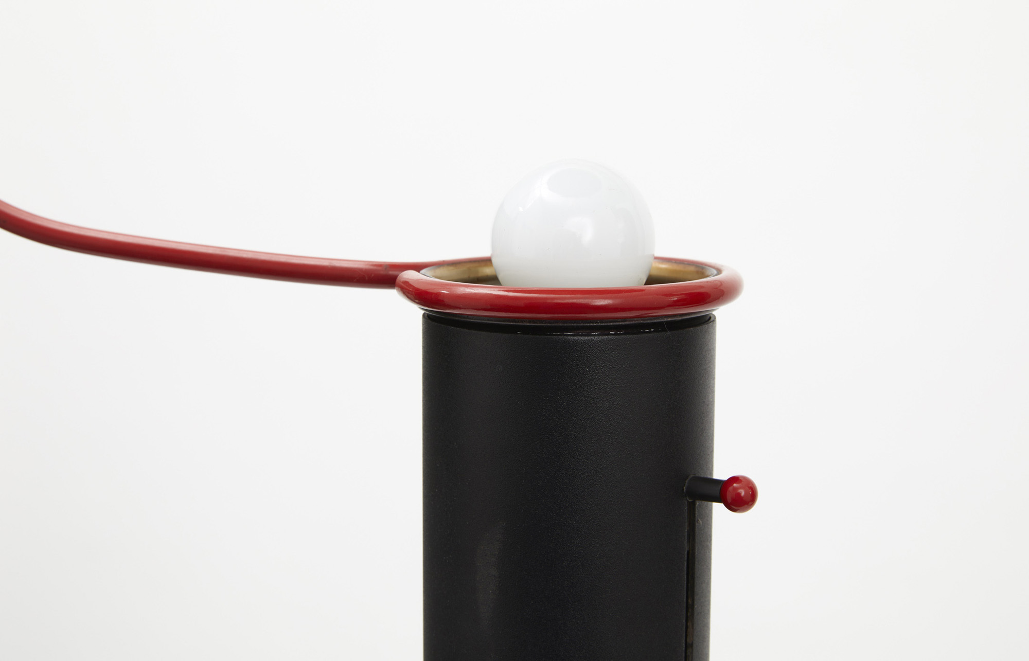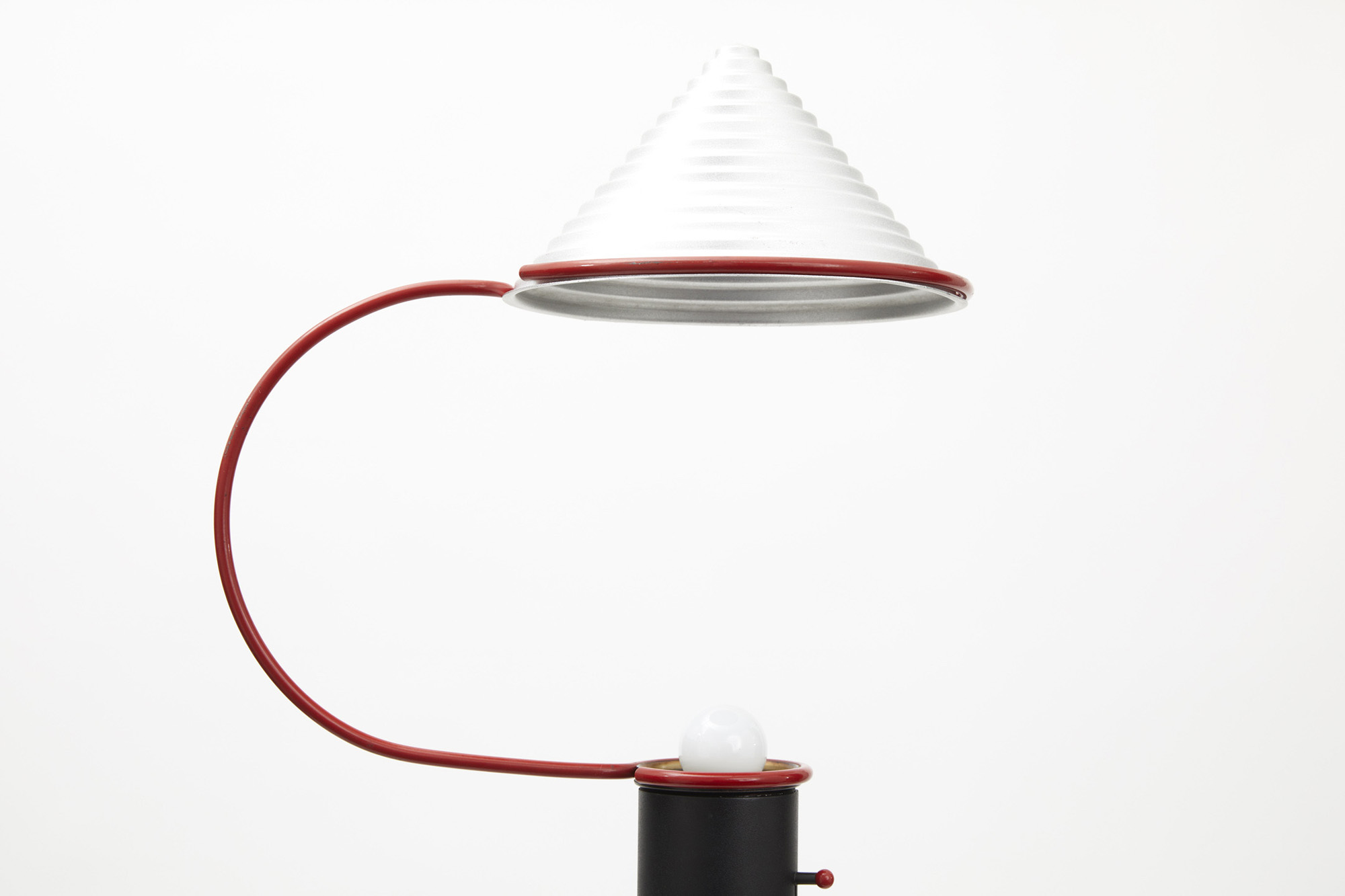 Il diffusore conico in alluminio color argento è inserito in un braccio in metallo laccato rosso e presenta una lampadina regolabile a scomparsa.