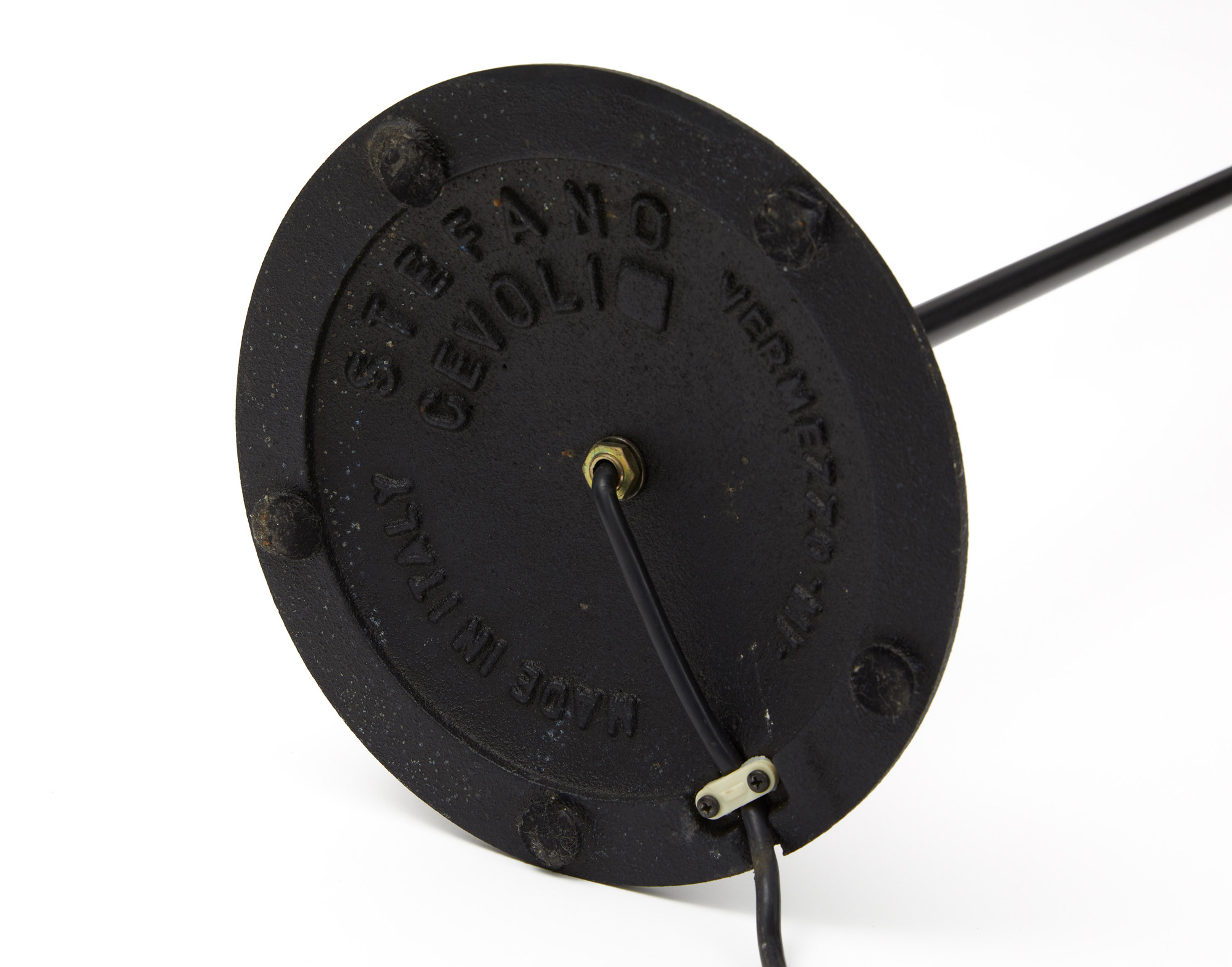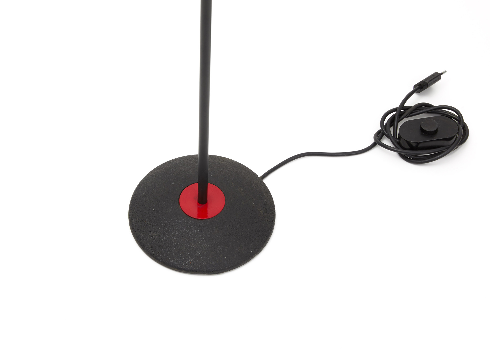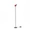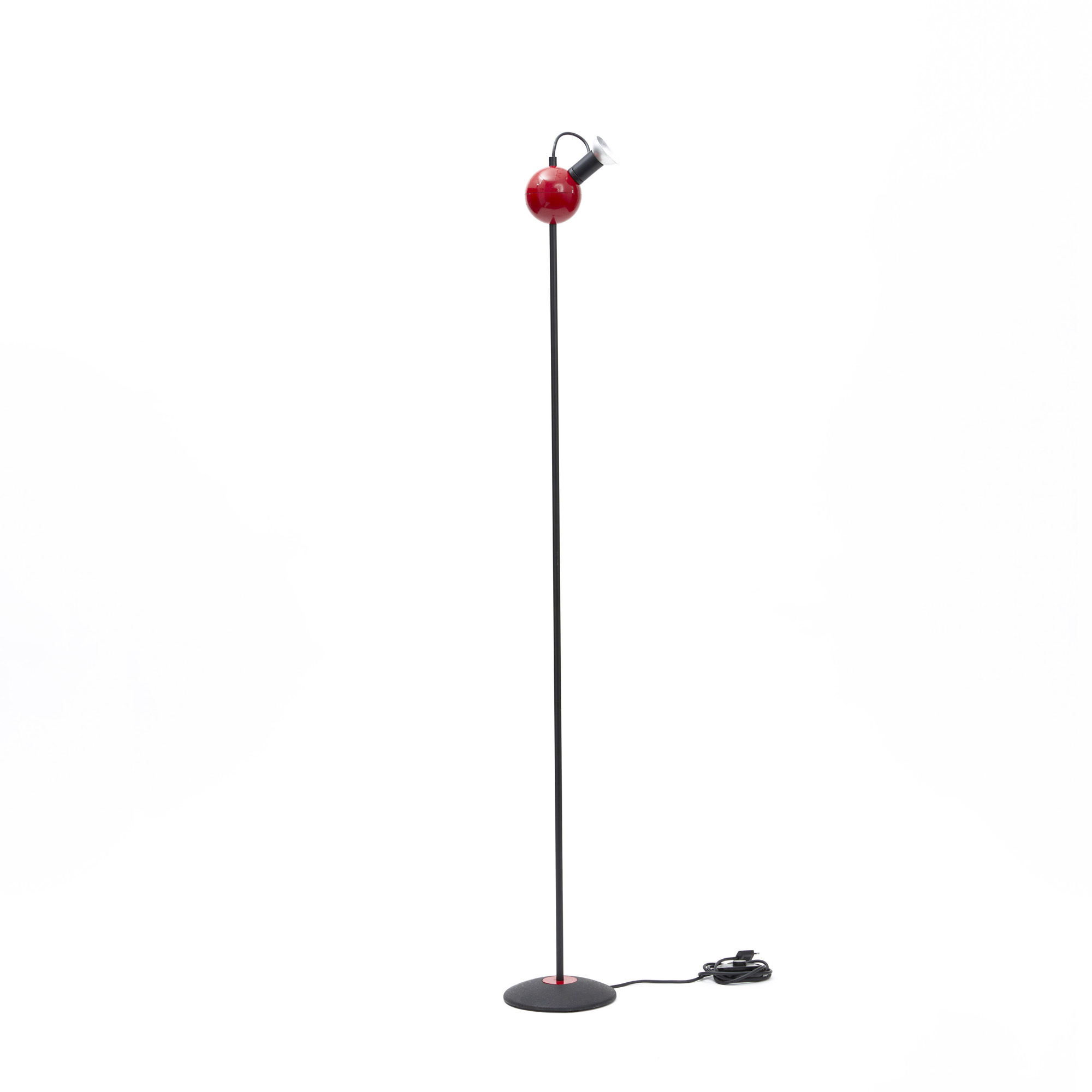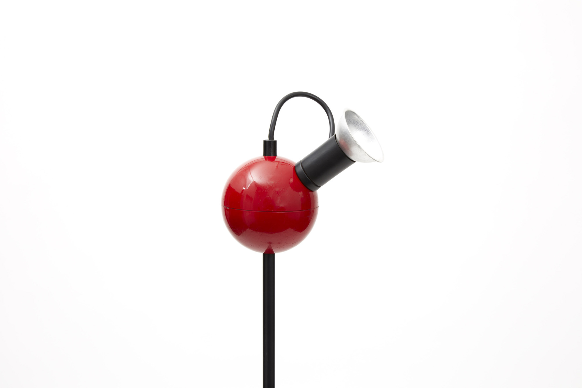 Faretto a calamita regolabile su sfera in metallo laccato rosso.