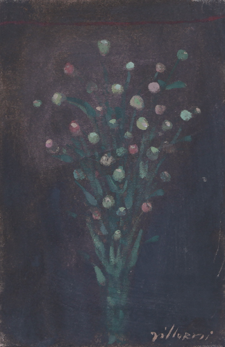 FRANCO VILLORESI Citta' di Castello 1920 - Rigutino 1975  Ranuncoli filo rosso olio su tela cm. 30x20, firma in basso a destra, titolo ed etichetta di collezione privata al retro.
