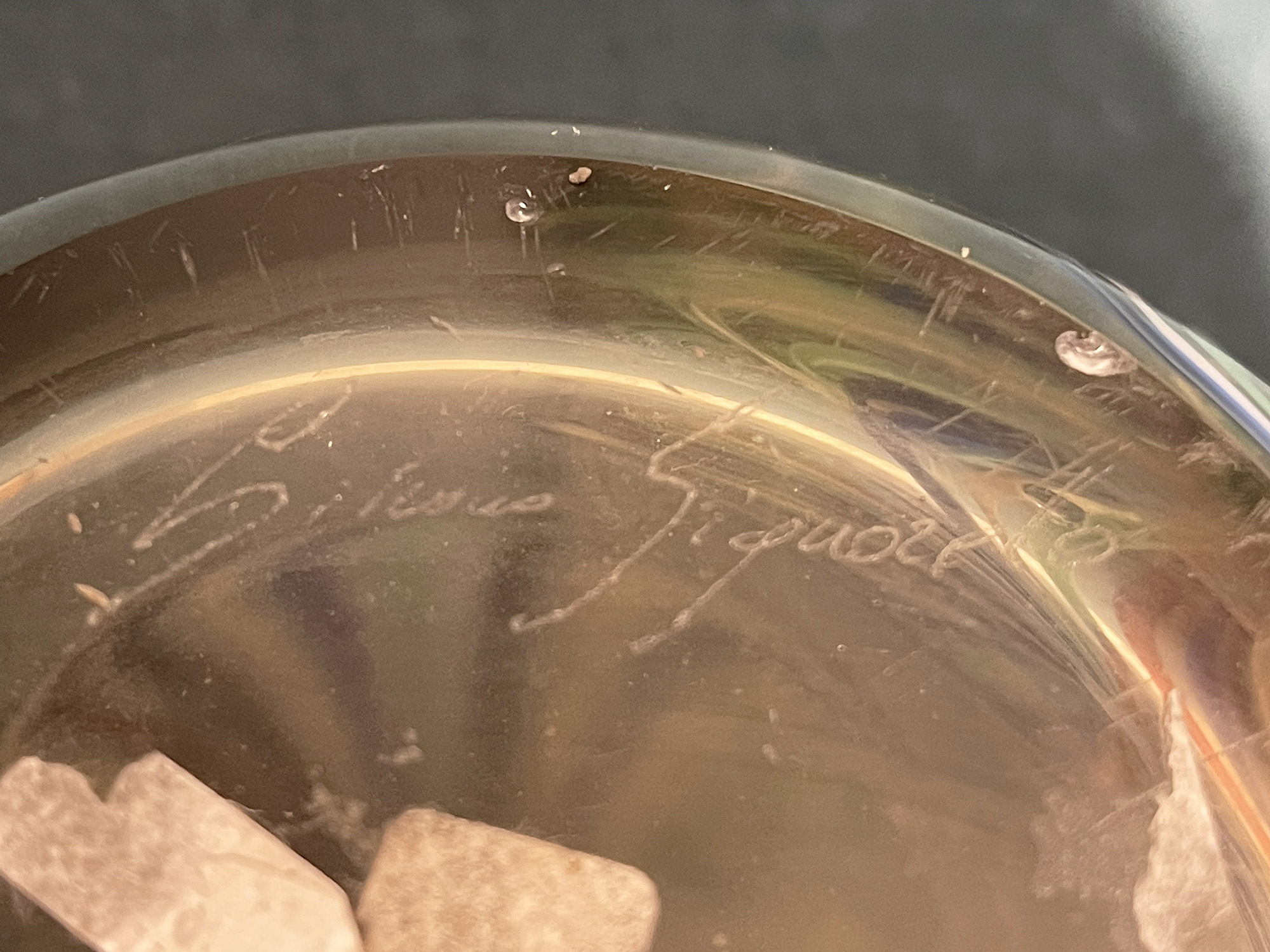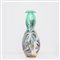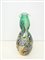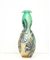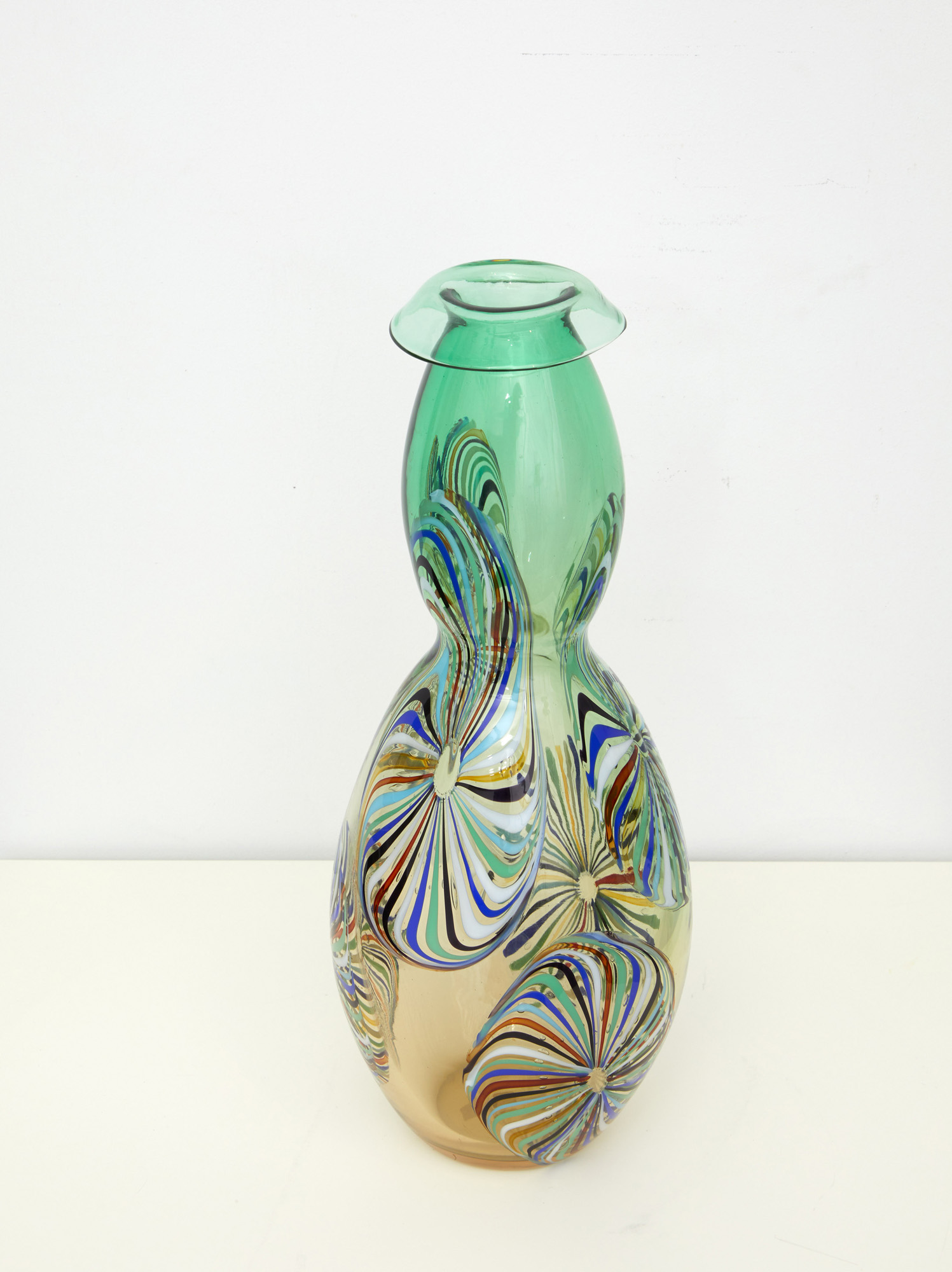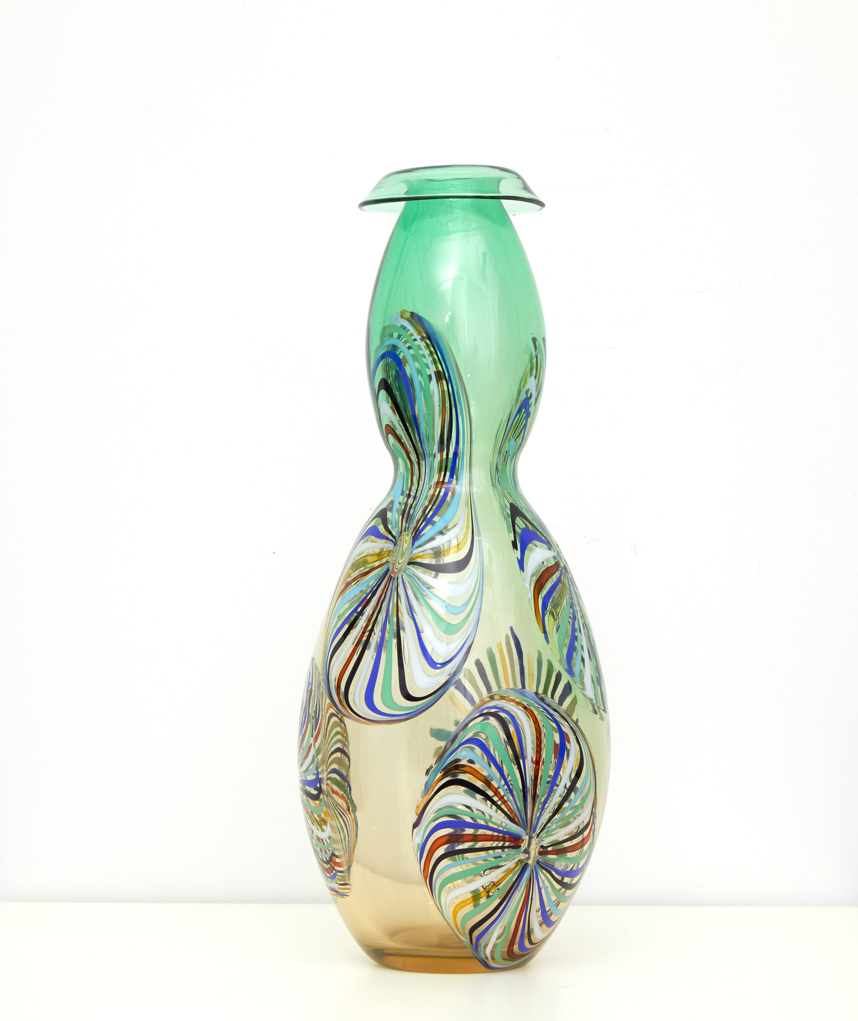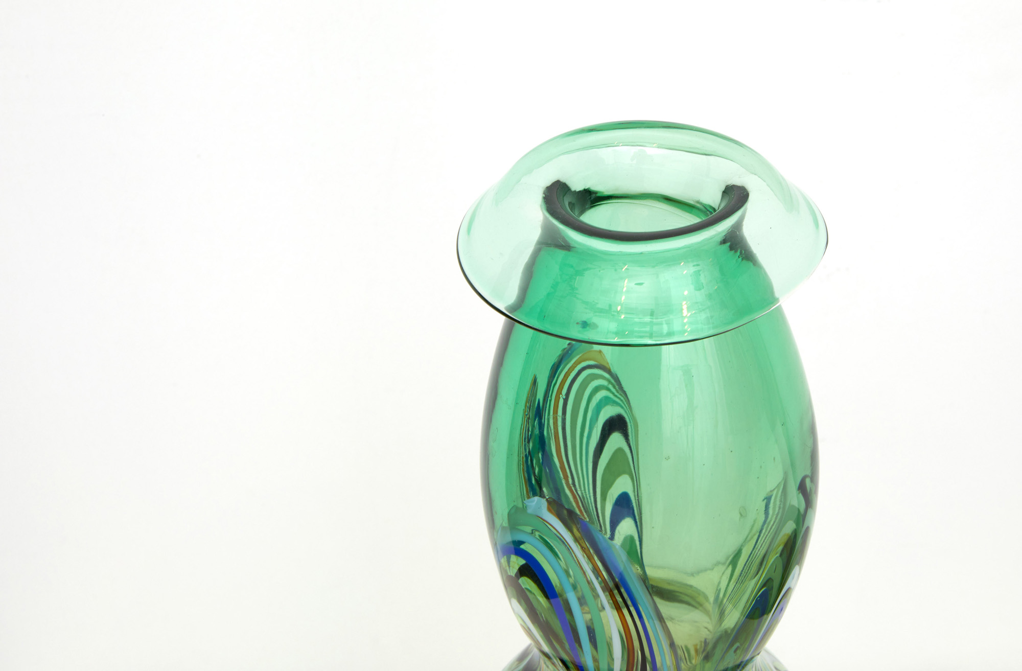 Vaso in vetro soffiato di color verde con canne multicolori composte a fiori stilizzati realizzato da Silvano Signoretto.