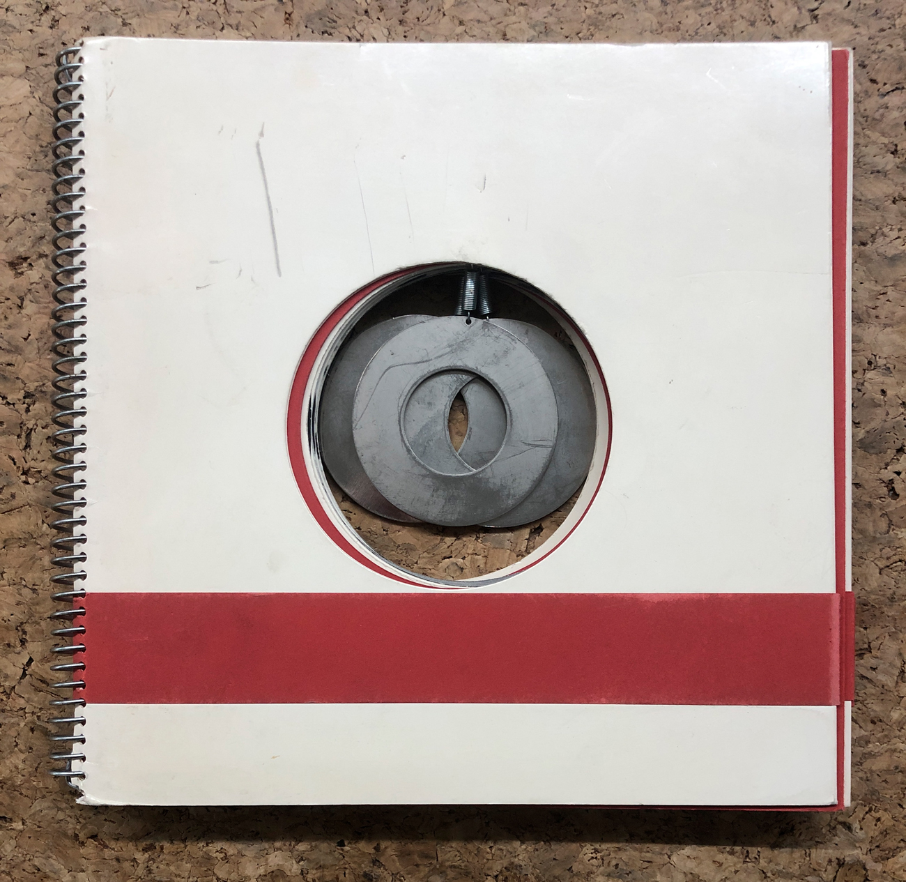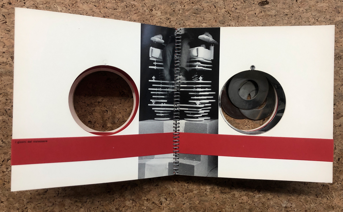 Rara edizione recante pagine forate con cartoncini doppi, inserimento di anelli metallici, pagine trasparenti, pagine a specchio, pagine bianche, pagine nere e, in una striscia rossa che le percorre, una presentazione di Achille Bonito Oliva