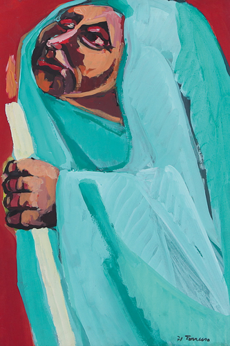 SAVERIO TERRUSO Monreale (Pa) 11/01/1939 - Milano 03/03/2003 Orante, 1971 tempera su carta applicata su tela cm. 58x39, firma e anno in basso a destra, dichiarazione d'autenticità dell'artista su foto.