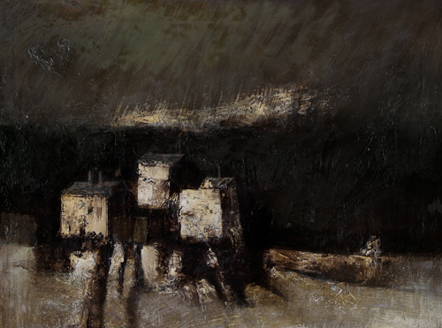 GIORGIO SCALCO Schio (Vi) 08/04/1929 Case sul torrente, 1960 olio su tela cm. 72,5x99,5; firma, titolo e anno al retro sul telaio.