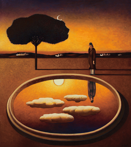 FRANCO FORTUNATO Roma 06/12/1946 Il cercatore di tramonti olio su tela cm. 90x80, firma in basso a destra, titolo e firma al retro, dichiarazione d'autenticità dell'artista su foto, pubblicato sul catalogo della mostra "L'altra faccia della luna, opere di Franco Fortunato", tenutasi presso i Magazzini del Sale (SI) dal 17 aprile al 22 maggio 2011, pagina 33.