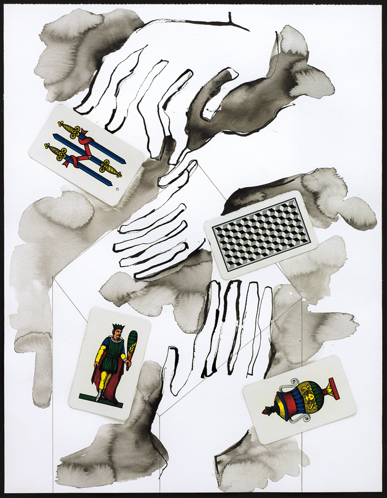 MIMMO PALADINO Paduli (Bn) 18/12/1948 Le ceneri di Pirandello, 2008 tecnica mista e applicazioni di carte da gioco su carta cm. 40x30, firma, titolo e anno al retro, dichiarazione d'autenticità dell'artista e Archivio Mimmo Paladino n° MP P08 su foto.